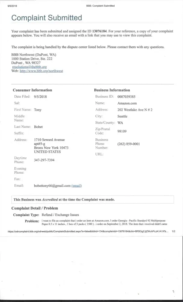i am filing an complaint to Amazon.com. The address is 202 Westlake N #2, Seattle, WA, 98109, Telephone # [protected]. I am filing an complaint they are not going to give my refund back. i order an item, Georgia-Pacific Standard 92 multipurpose paper. 8.5 X inches 1 box of 3 packs, $21.95, the order number is [protected]. i didn't received no tracking number and they come with excuses that they have to contact the seller is Top Quality Product is Amazon.com. I want my refund back. I will continued asking for my money. Additional, I file complaint to BBB.com. Here is Complaint Number# [protected].