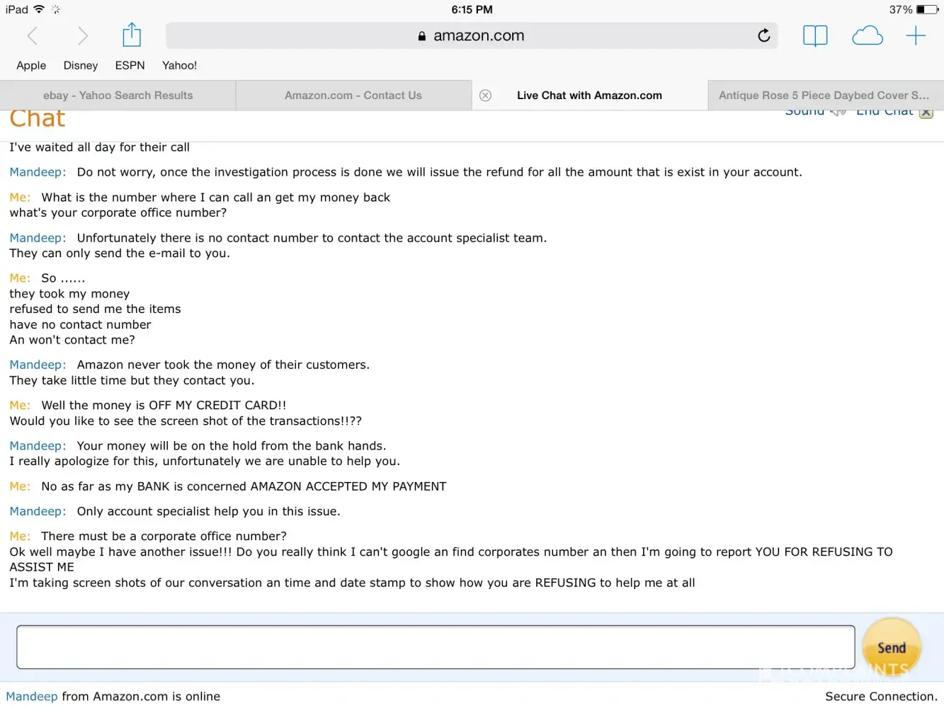 He replies usually 24hrs, I waited 2 days an I chatted AGAIN an explained everything AGAIN only to be told they can't help me only the team specialist can, I said FINE!