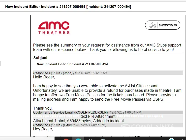 The $40 AMC tickets have not been mailed to me so provide a gift card.