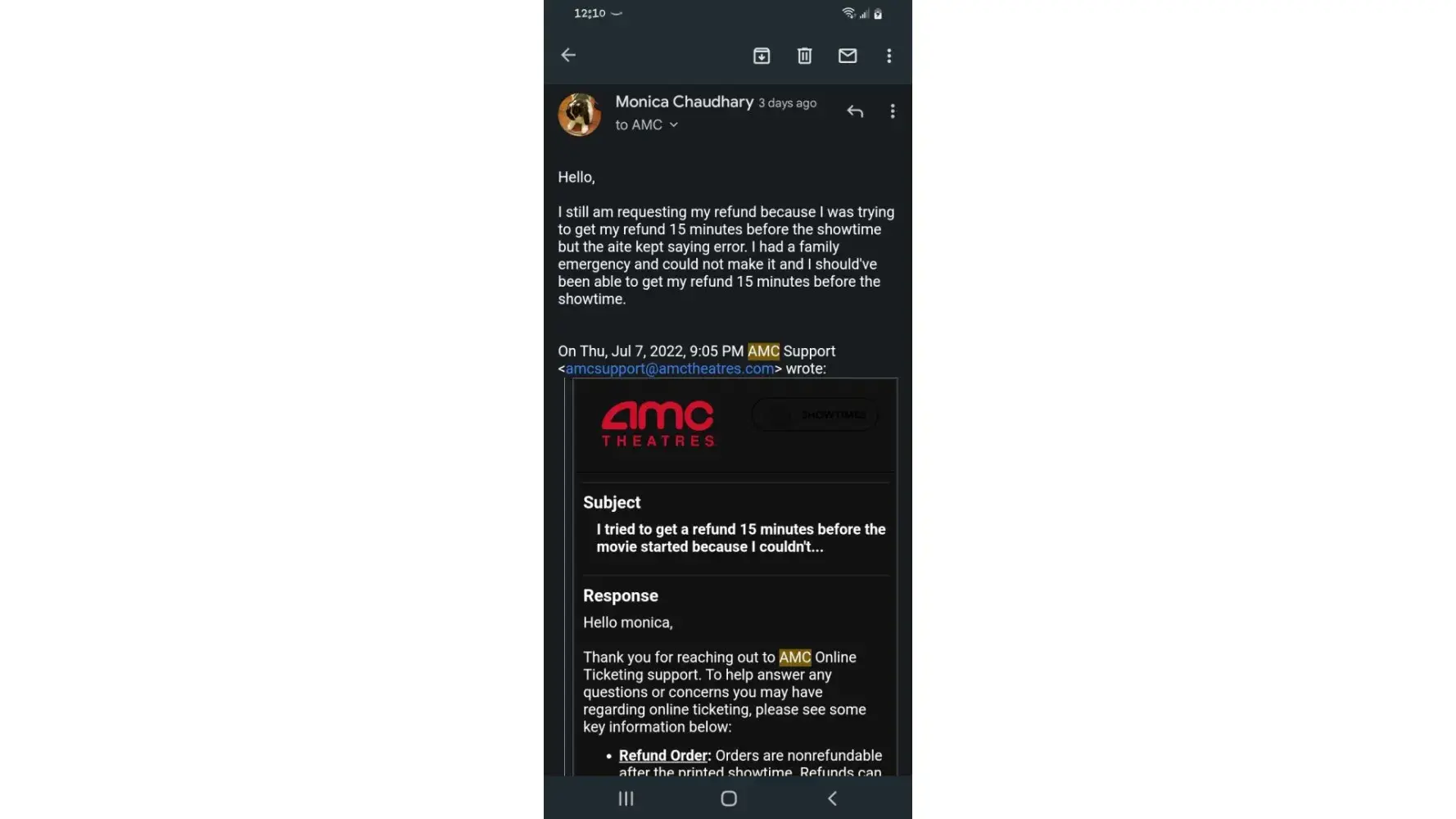 I purchased tickets on 6/18/22 to see Thor: Love and Thunder on 7/7/22 for a 9 pm showtime. About a half hour before my showtime, I received a phone call and I had a family emergency. Around 8:45 pm, I went into the AMC website to request a refund for my tickets and it kept giving me an error so I had to keep logging out, refreshing, going back in and I still continued to get an error so I couldn't even request a refund for my $71.06 purchase. I sent an email to customer service that night at 9:05 pm and they sent back an email on how to request a refund and if that doesn't help to email them back. I emailed them back around midnight which was when I was able to get back to my phone and they have not responded yet. I sent another request for them to contact me which opened another incident number and still no email back. I tried calling the customer service number and the automated response said their phone lines are not open and we should send an email.