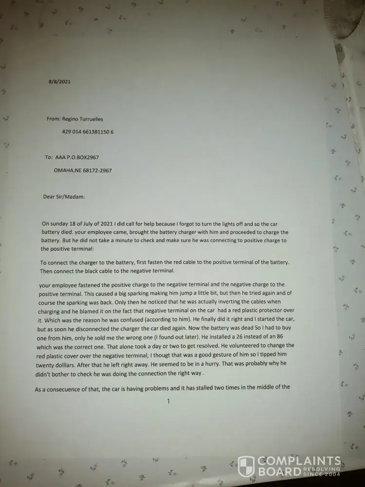 On july 18th I called aaa because I needed a jump start. An employee came an proceeded to the work but he was careless. He crossed the cables when trying to jump start the car causing a lot of sparks come out when trying to make the connection. A second try gave the same results. A third time was the right one, but by this time the battery was dead then and so other parts of the car I found out later. I had to buy another battery from him. After he installed the new battery he left. He said "I hope it didn't burn any fuses". He left right away. I tried the car around the block and I noticed the car was behaving different (like it was going to die any time). I took the car to the mechanic. He scanned it and the results were the air intake hose had been damaged (that would cost around 300 dollars but it is possible that the car computer has been damaged in which case it would cost 1000 dollars. Also they installed the wrong battery. That also can cause damages to the alternator. I have not been able to use the car anymore because it already died two times in the middle of traffic. I have called many times and I have written a letter to them. First they told me somebody would call me in two days. After three days I called back and then I was told I had to wait 7 to 10 days. Now it has been almost a month and nobody calls me for anything. I don't think they intent to accept the responsibility for ruining my car. They are just letting the time run and ignoring me after being their customer for years. The last time I called they gave a case number: cts 34252.