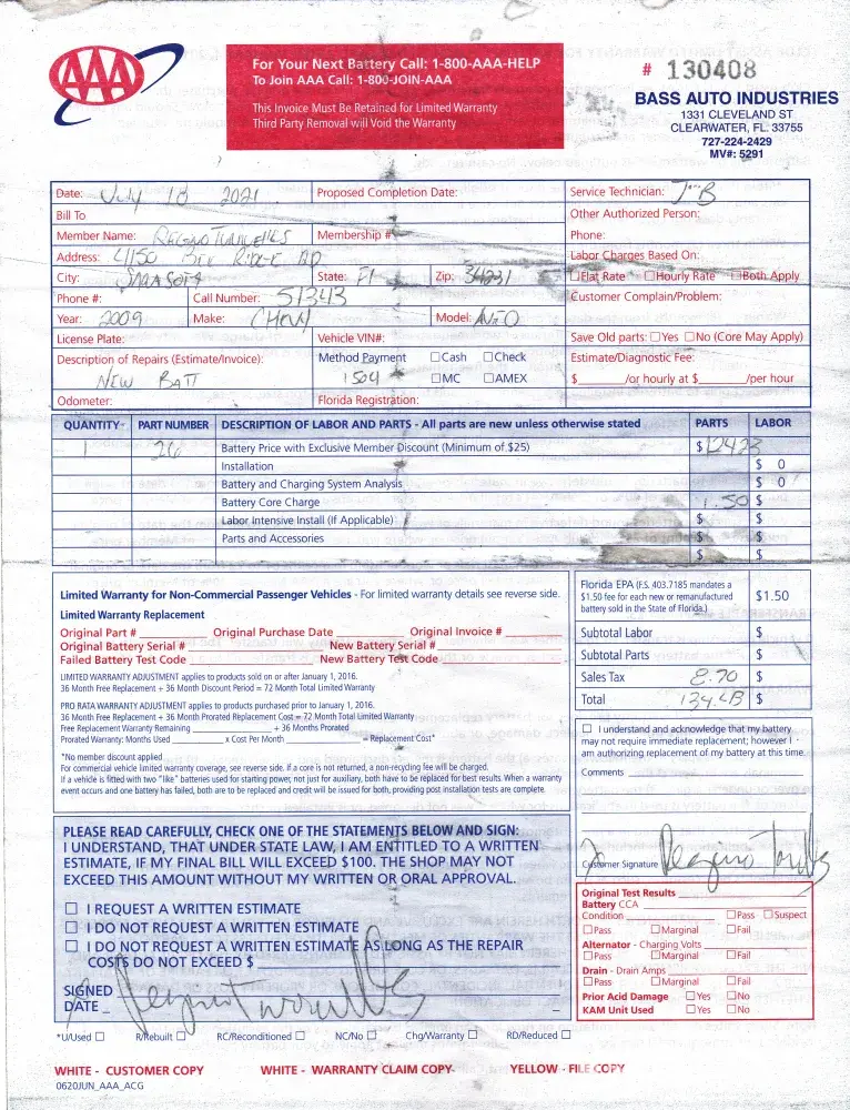 I called AAA roadside assistance on Friday, September 3, 2021 because my car wouldn't start. It was in my driveway at home (address above).
