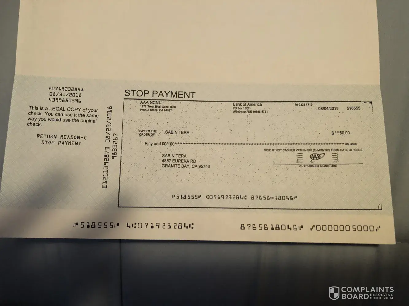I submitted a windshield reimbursement via fax. AAA mailed out a check to me sent it to my old address, fortunately my old roommate gave me the check. I deposited it and then AAA decided to put a stop payment on the check with NO warning to me what so ever and my bank charged me a 10.00 charge back fee. AAA did not contact me at all, I had to call them to find out why they did this and I was told that they made a mistake and a new check would be on its way to me. I have been in contact with AAA representative Destiny Hoskins and have sent her the notice from my bank about the fee I was charged and asked that your Company reimburse me the 10.00 for the inconvenience I was caused, she told me that unfortunately she cannot not issue a reimbursement. I am outraged at your Companies lack of professionalism and outright awful customer service. I am a premier AAA card holder and this is totally unacceptable.