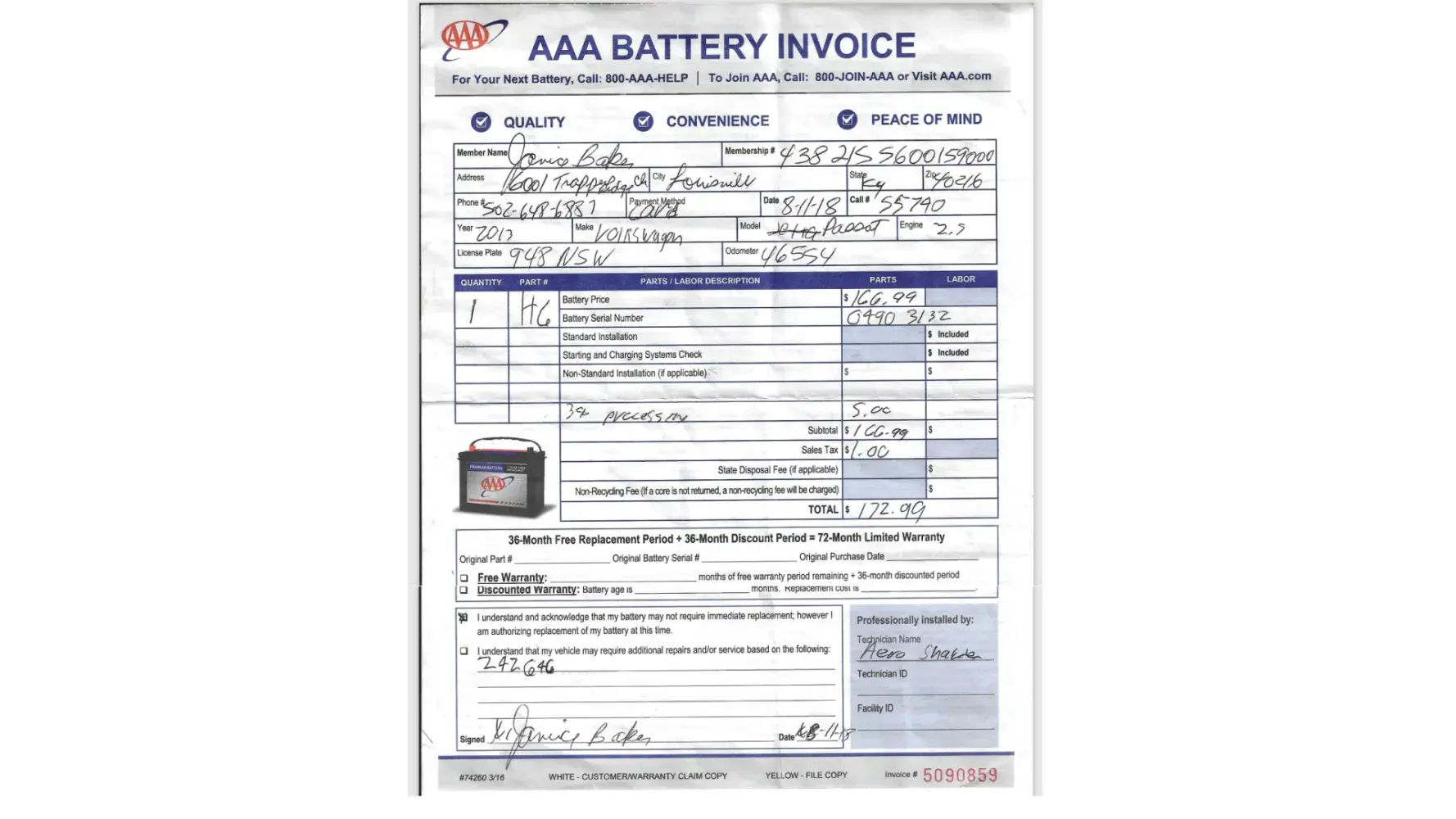 AAA Call/Case #186318 - I called AAA on 8/22/23 for service because my car would not start. The wrecker service arrived within 45 minutes of the call. The first thing he did was jump started my car and said that it's a battery related problem but not sure if anything is wrong. I pulled out my invoice #5090859 of the battery that I purchased from AAA on 8/11/18, which was still under warranty. I expected that AAA service technician to replace the battery, but instead he stated that he didn't carry batteries on his truck and called another AAA service technician that specifically service batteries and carried batteries.