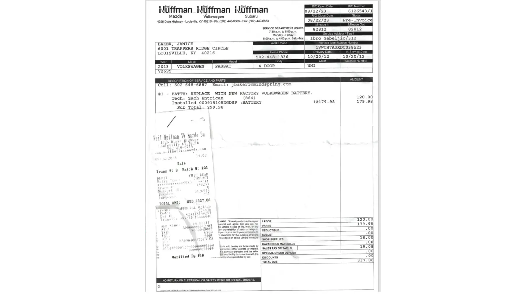 Desired outcome: I'm requesting a full refund that labor and battery the installation of correct battery from the Huffman Volkswagen dealership (see attached invoice #6126543/1