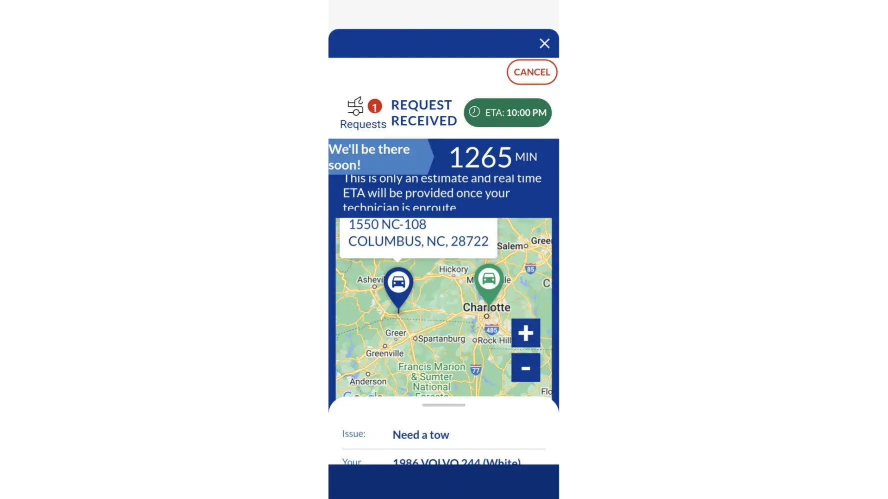 Desired outcome: I want my car towed from Columbus, NC to Charlotte, NC today (08/29/2022) on a flat bed truck without me or my keys being there. I can provide necessary identification when they arrive.