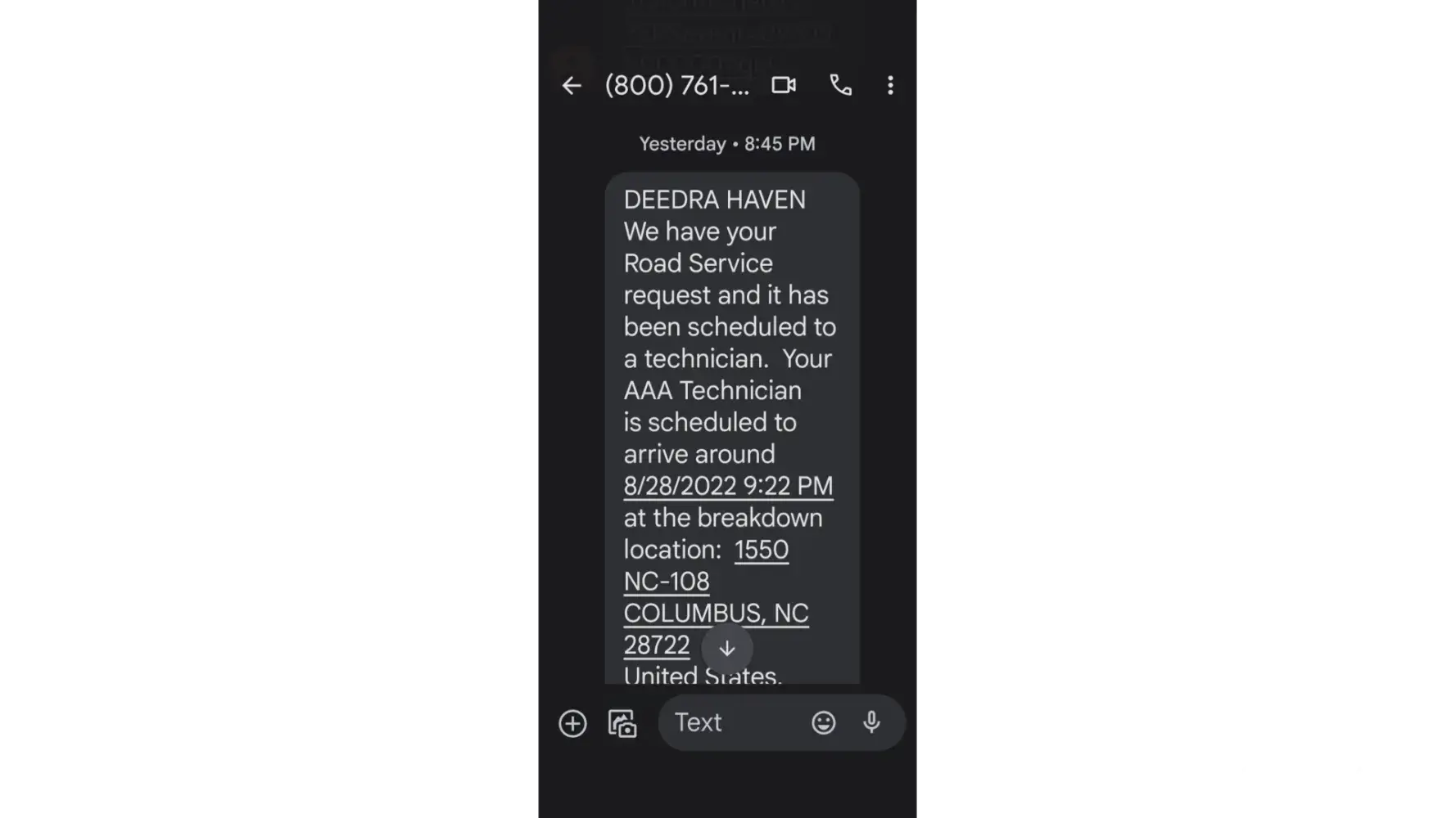 On September 21, 2022, Membership #[protected], Stan and Debbie Burns. My car wouldn't start and I was away from home in the rain. I tried to call AAA on my cell phone and was told to get the text. I got the text, pushed the message and it wanted to know if I was a robot and pick the pictures of boats then buses which I did but it said I was not able to talk to anyone because, I don't know. I tried this 3 times and no go. I am not tech savvy.