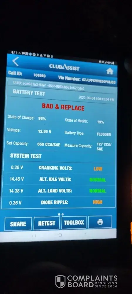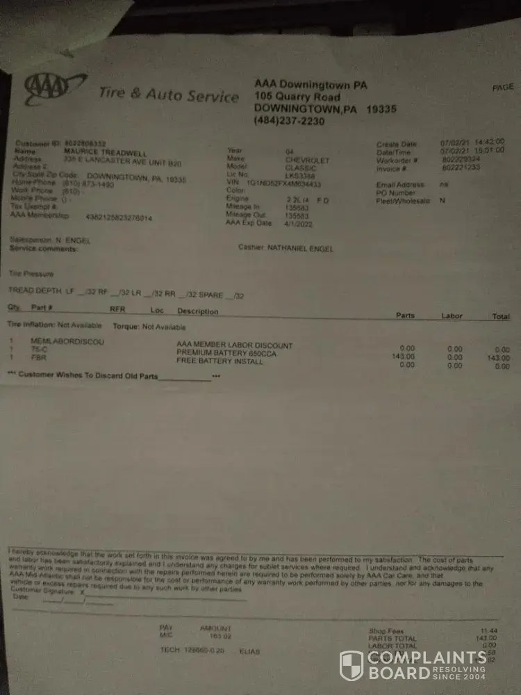 On 9/4/2022, my husband put into the AAA app, for assistance with starting his car. The AAA service person came and the information that was sent to him was incorrect. He checked the battery, that we had bought from AAA on 7/2/2021. It states right on the battery that there is a 3 year free replacement. The battery is bad per the battery test given by the service person. My husband asked, could the battery be replaced, since the battery was bought from AAA? He said that he had to call to see if it could be replaced. My husband had the bill of sale and showed the driver. The driver came back from his truck and said that they had no record of the sale, yet my husband had the service person read the information to the man on the phone. He still said they had no record of the transaction and they could do nothing for my husband. My husband asked, could the billing information be sent by a screenshot? The screenshot was sent and the man still claimed it couldn't be verified. Still we was told that AAA couldn't do anything for my husband. The battery was bought at the Quarry Road store in Downingtown, PA. Why wasn't the transaction in the computer, to be verified of the sale?
