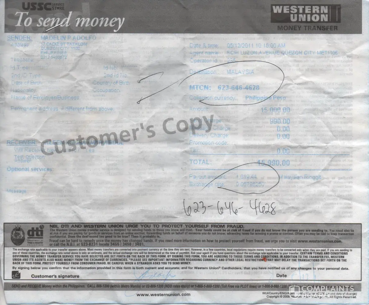 5. Official receipt of western union control number [protected] one thousand nineteen and 44/100 myr (Myr1, 019.44) dated may 12, 2011 for the insurance;
