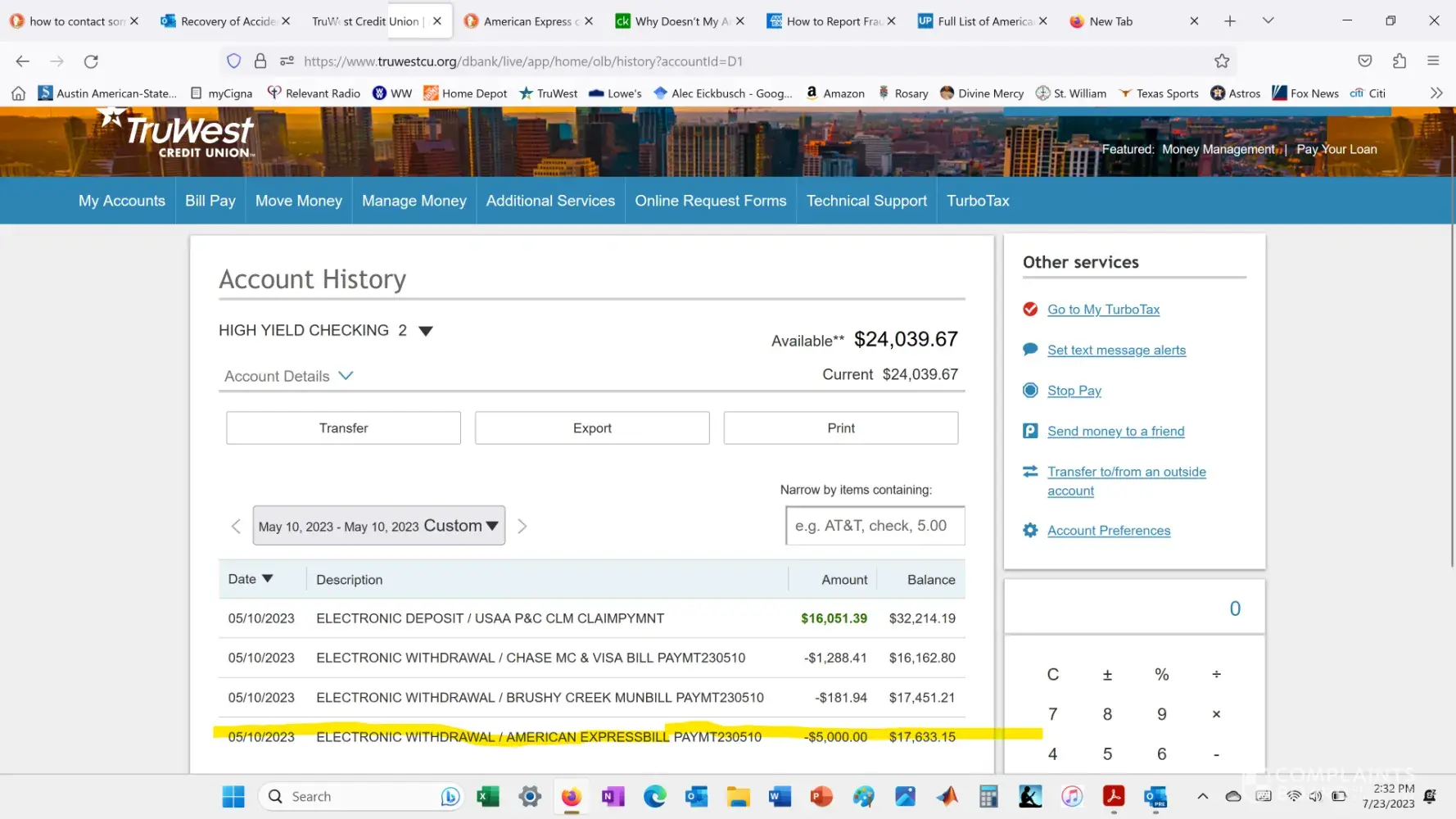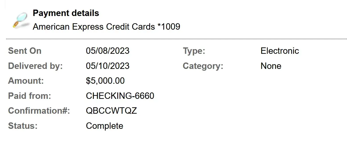 I can still get transaction data on this account by dialing the American Express general number and entering the account number. The information it provides is that a $5000.00 payment was received on May 10th, however, the balance indicates zero dollars.