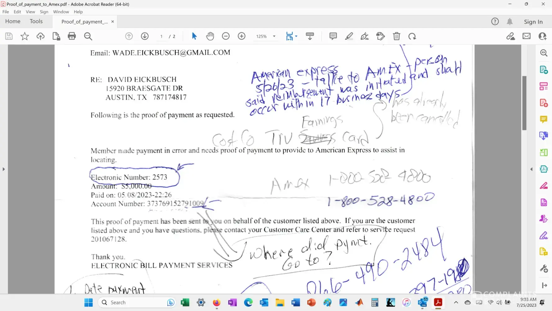 I paid my bill in August of 2019, in the amount of $904.08, and American Express has denied receipt of the payment stating I owe them $903.71, causing me to have a negative rating on the deadly credit reporting agencies. This has persisted to exist even though I have sent numerous faxes, and a return receipt request, with a copy of my bank statement indicating the payment to them.