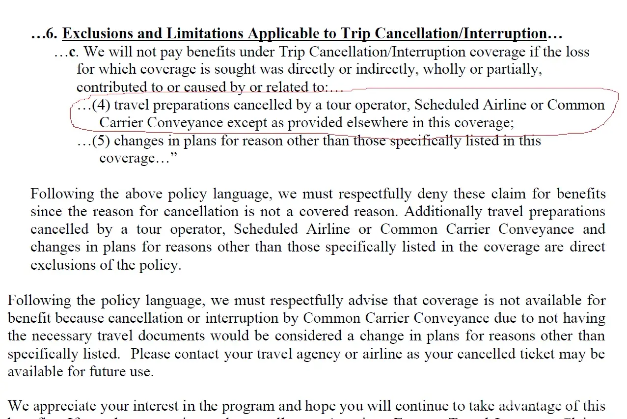 AMEX ASSURANCE COMPANY will take 1 Month to read in detail everything possible to deny the claim, nothing wrong with that since I cannot blame them for doing business. I blame myself for not reading the "fine print" in detail. Trips cancellation are most of the time issues because of boarding denial for Visas, COVID or other situations out of your control, AMEX ASSURANCE COMPANY does not cover any of this. Stop thinking that they will understand your situation and see in detail all proofs provided: it will be denied. So before spending your money on them if you think they will cover "any reason" for trips cancellations or delays. (No matter the level of coverage you buy: Platinum in my case). They are very strong when giving you the answer, and they will go all the way to deny the claim. Look at the pictures included. In a time where COVID is affecting the country, what other issues affect trip cancellations? I thought I was covered when I purchased this expensive ($380.00 Extra trip coverage - Platinum), I was wrong.