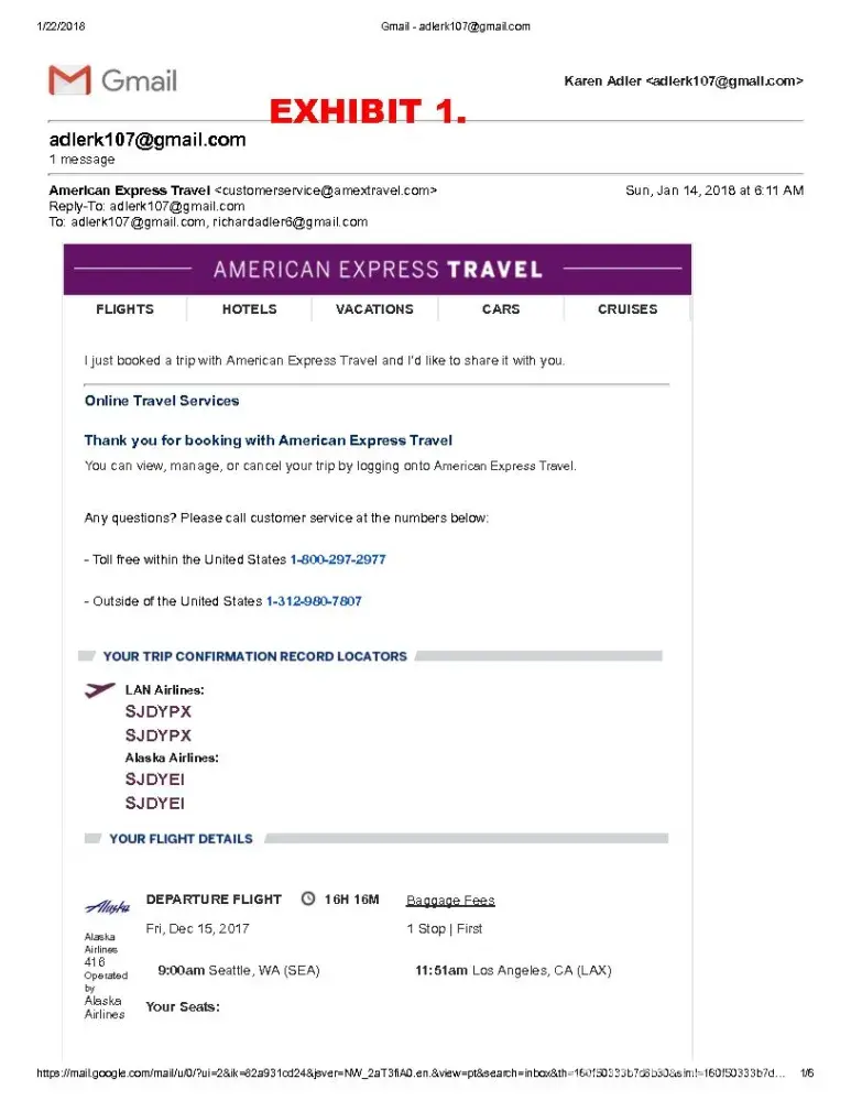 EXHIBIT 3: Final Itinerary as downloaded by Karen L. Adler 01-22-18 on the AMEX website under "myamextravel.com"