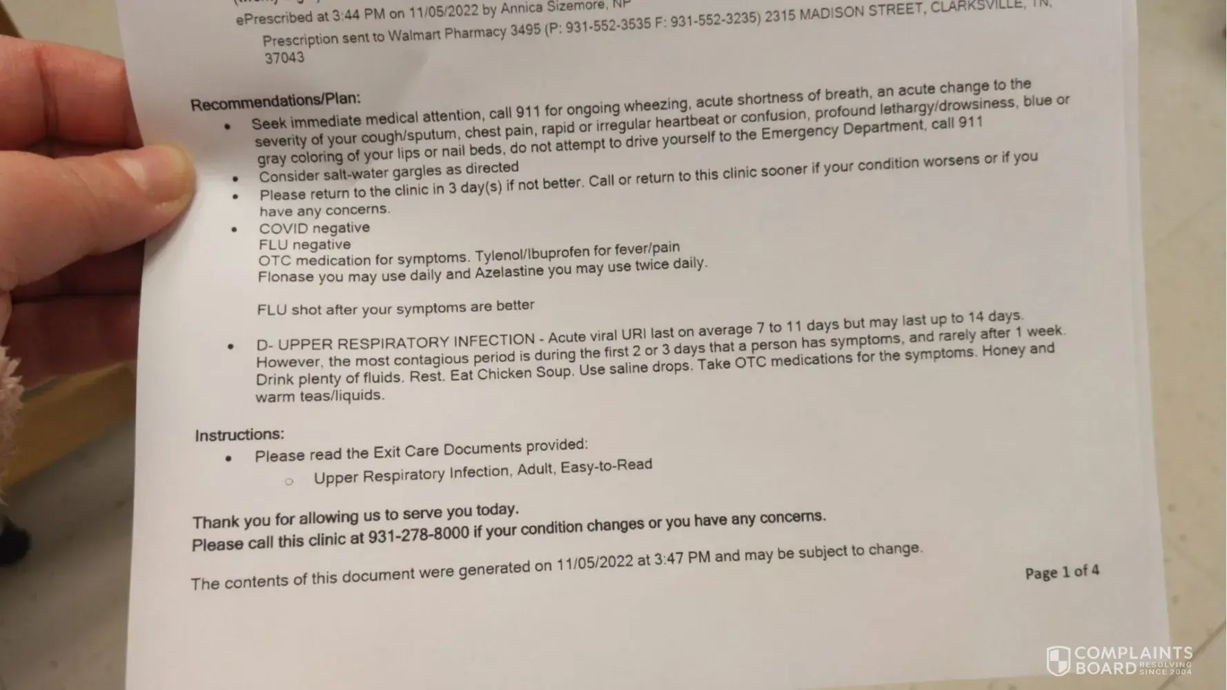 Desired outcome: Make sure you do a better job when people are sick. No matter what color they are. Don’t have patients waiting. Insurance should not be charged for either visit.