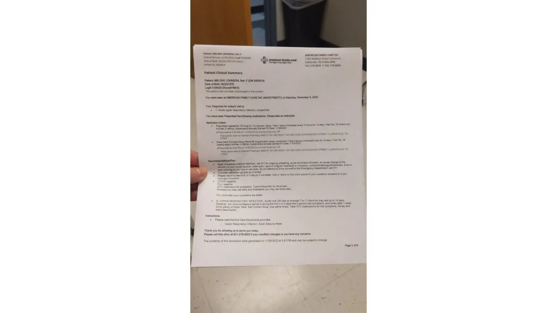 This doctor did not even examine me She sent the nurse and to do nasal swabs for COVID and flu. The doctor would not even come into the room completely. She acted like she was afraid to get close to me. So here I am completely congested and wheezing. It's hard for me to breathe. I'm hurting all over the place from coughing My back my neck my sides and all...