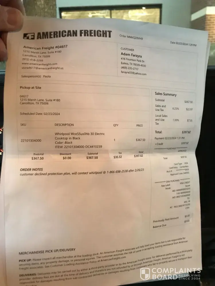 Contacted American Freight through Facebook chat and sent them an email with what I mentioned above. The manager called me and refunded my delivery charge, told me (which I verified) the warranty was available on the assurant site and APOLOGIZED for all for the hassle. Due to the experience of the sub-par appliances, I would never shop there again or send anyone I know there but it is nice to know that AF cares enough to follow up even though it was SUPER difficult to contact anyone for the complaint. Their website forms do not work.