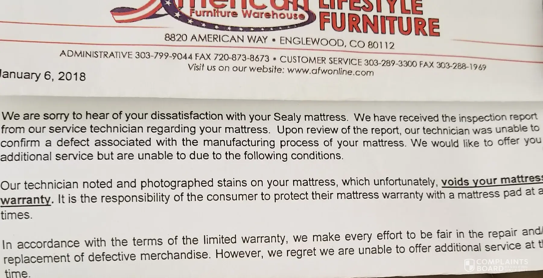 I purchased top of the line Sealy mattress set 15 months ago from AFW in Grand Junction, CO. It has a 10 year warranty. After submitting a claim with AFW, they sent someone out to inspect it. I received a letter that states that because it has a stain, it voids the manufacturer warranty. This stain is on the very edge of the mattress and occurred because my window was open when my sprinklers came on. Now when I called, they informed me that it was out of their control and that the decision was based on the manufacturer warranty. I was also informed that they couldn't monitor if the customer was provided the warranty information.