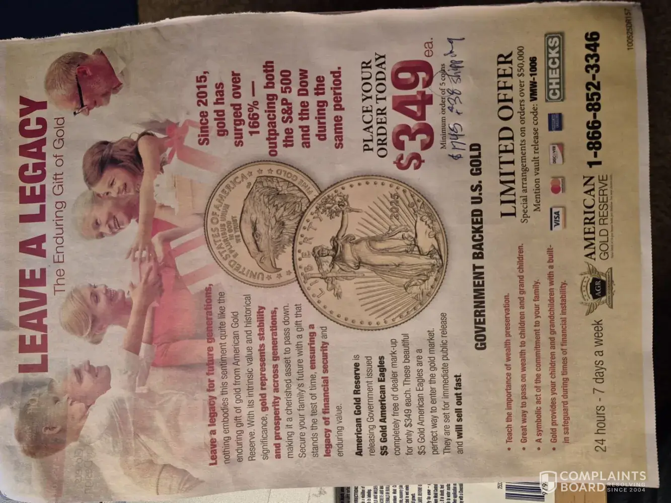 I saw an ad in my *** Magazine for gold coins at $175 each from American Gold Reserve on 6/26