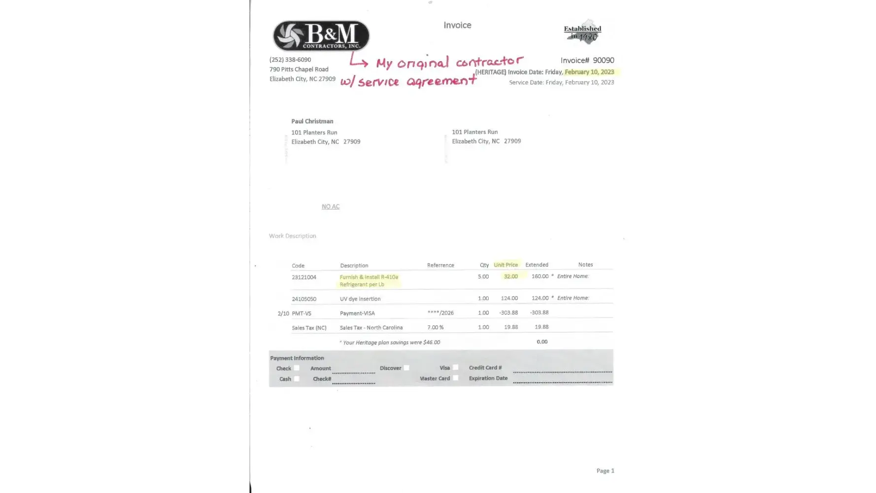 (My contractor) B & M ïƒ Refrigerant = $171.20