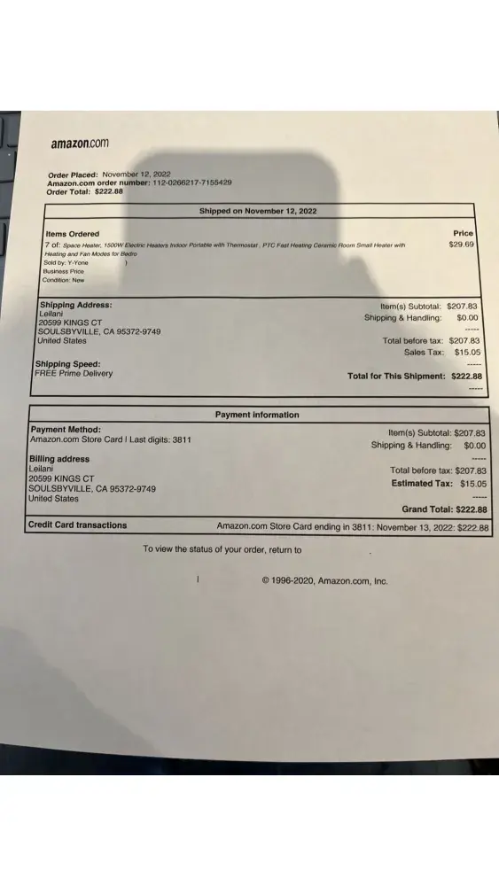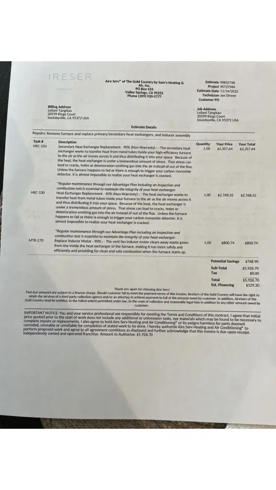 In the meantime, our ninety-six-year-old grandmother and terminally ill daughter is enduring unbearable cold weather conditions. We had no choice but to hire a local vendor called Aire Serve of The Gold Country to diagnose our heater on November 10, 2022 and paid a service fee of $200. The system has a failed heat exchanger, the unusual smell is coming from the flue pipe where 296 PPM of Carbon Monoxide were detected before shutting system down-Bad combustion smell. Verified flame is rolling back into the burner box. Due to age and repair cost a new unit is recommended. They recommended that we purchase space heaters for our home since AHS has failed to service our request since October 21, 2022 and the odds of AHS getting someone out for repairs has been painstakingly slow. We don't have an open floor plan and so seven space heaters were purchased from Amazon for $222.88.