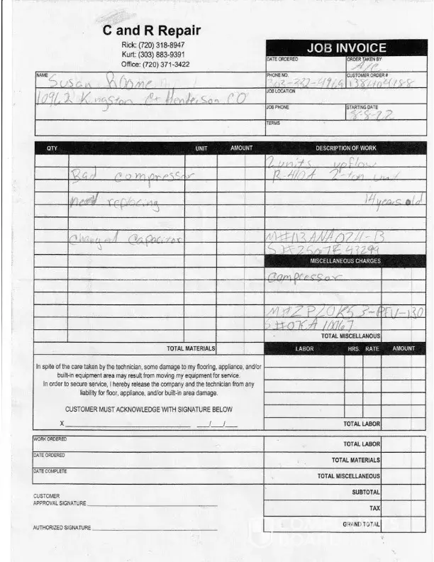 Desired outcome: I am in dire need of a repair/replacement for this AC unit to my home. The compressor is broken, making the AC Unit inoperable. If another repair contractor can do the job, as long as it is done correctly and in a timely fashion.