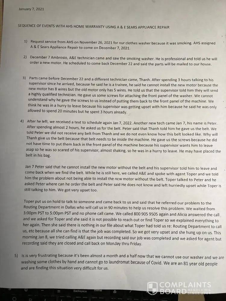 Dec7 A&E came ordered parts. 2 parts came. Tech came Dec 22 cannot install motor cuz new part has 8 wires but old has 5 wires. He's not qualified to do job & supervisor will send a qualified tech. Left screws cuz no time to put back on front panel. Supervisor mad cuz spent 3 hrs & shouldbe 20 min. New tech came Jan 7, after2 hrs, asked us for belt which we do not have. Tech before him said he left us the belt & not true. He said, cannot install the motor without belt. We called A&E while tech still here, agent asked tech where to order part, tech said he does not know. Tech left upset & left A&E agent who said Routing Dept in Dallas will call us in 90 min. We waited fr 3-5pm PST but no call. Called A&E, talked to Alicia said no note about the RoutingDept phonecall. Called AHS Sat 1/8, Tom said Field Manager/Dispatch will resolve this issue. See Attachment