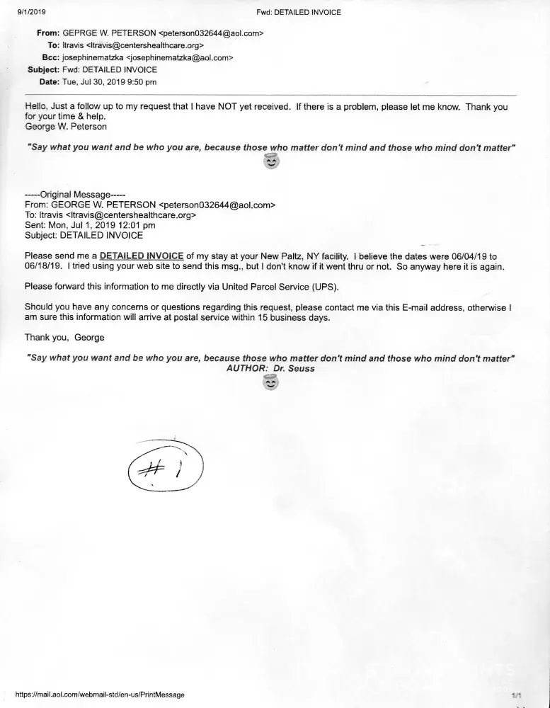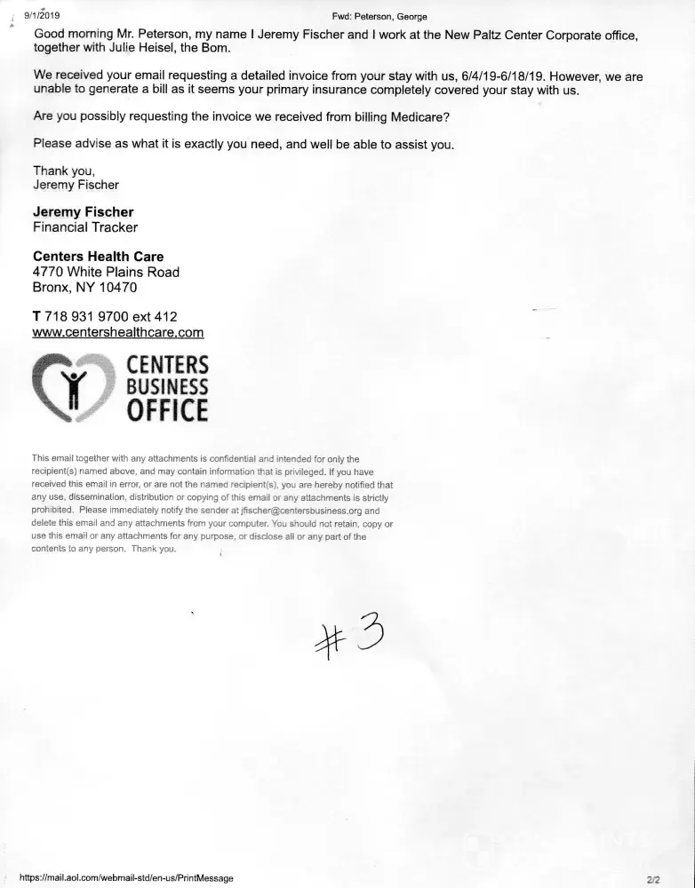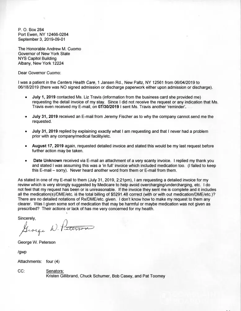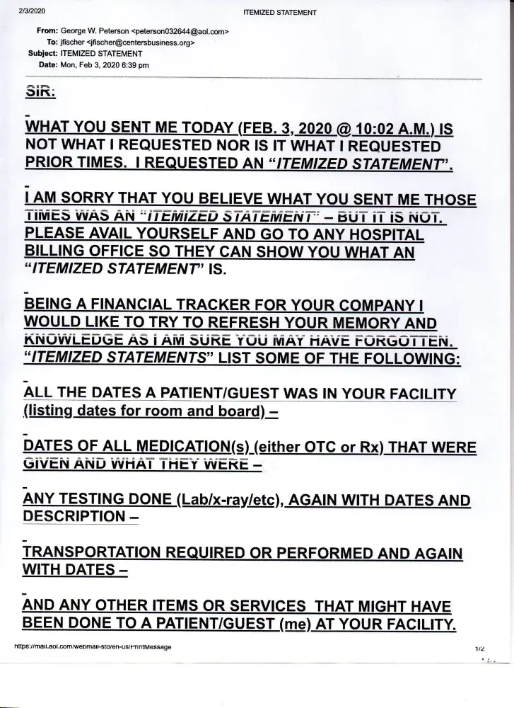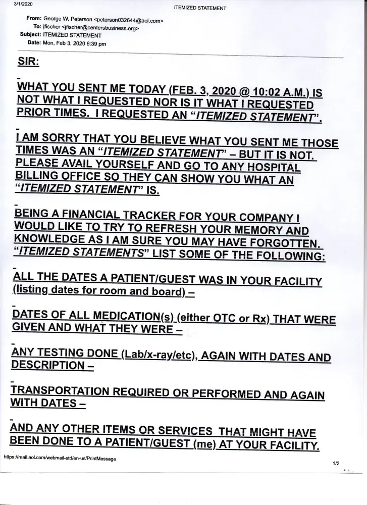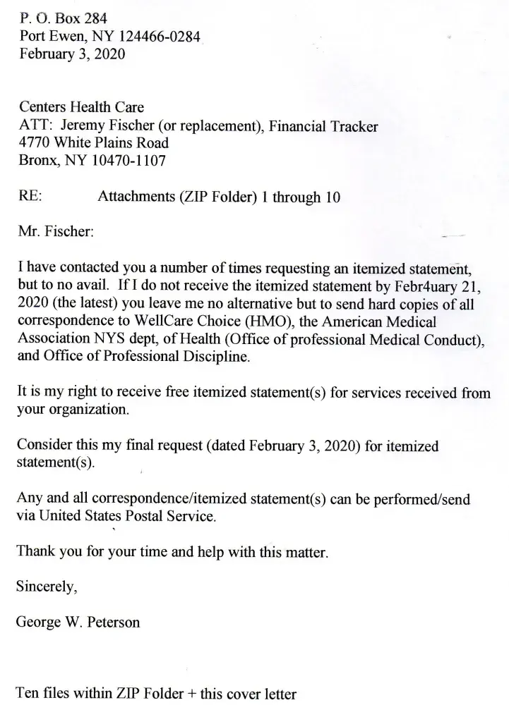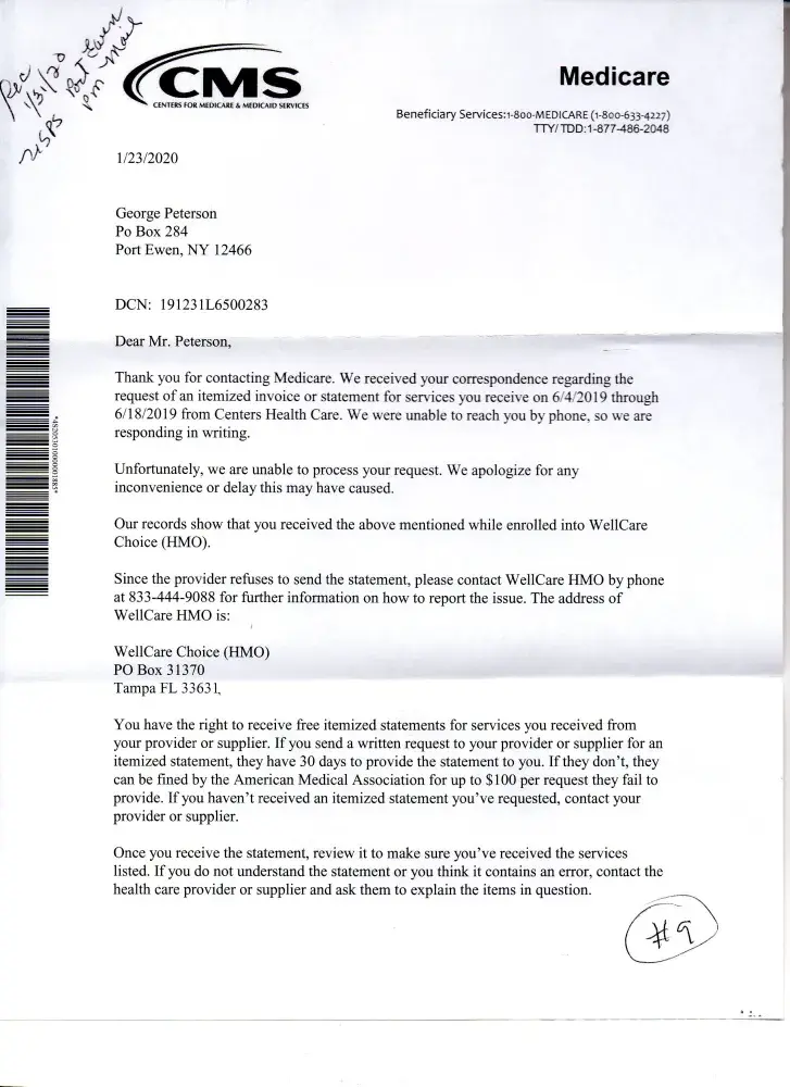 I started requesting an Itemized Statement for my 'stay' at the Centers Health Care [protected] X 412), New Paltz, NY facility in 07/01/2019. I was there 06/04/2019 - 06/18/2019. To date I have NOT received one. Having Medicare (at that time WellCare - I always request the Itemized Statement from a facility I was a patient at, so I may review (a...