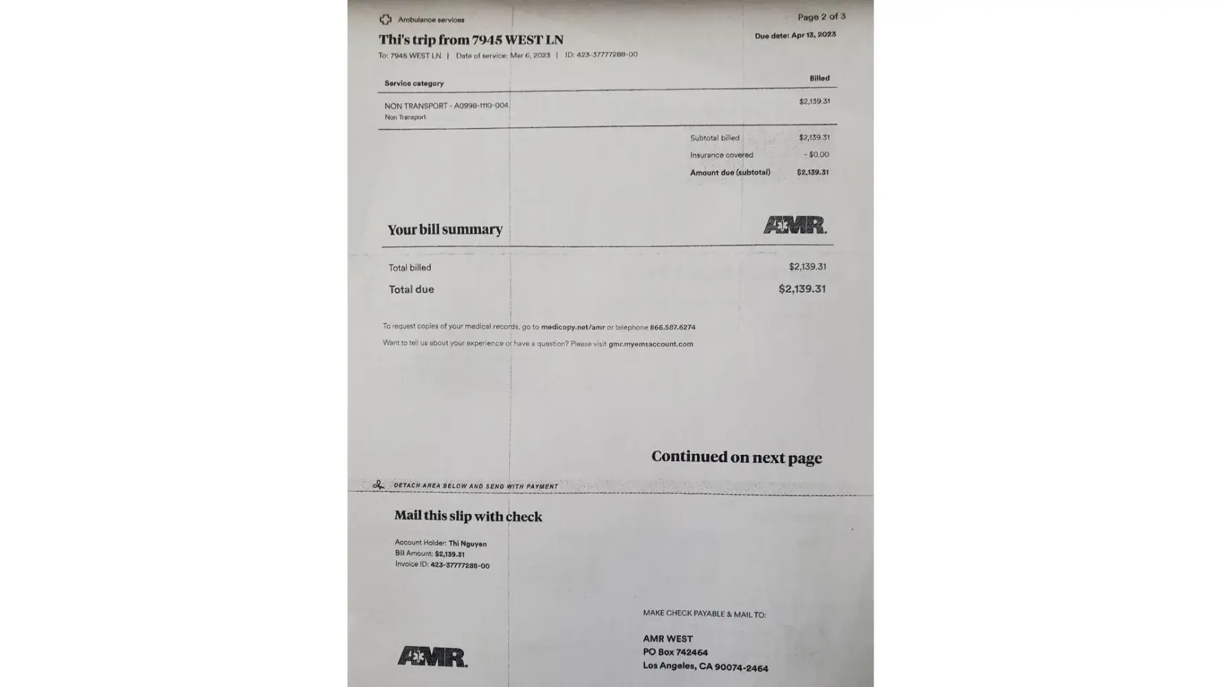 A few days later she received a ambulance bill ID [protected] foe the amount of $2139.31