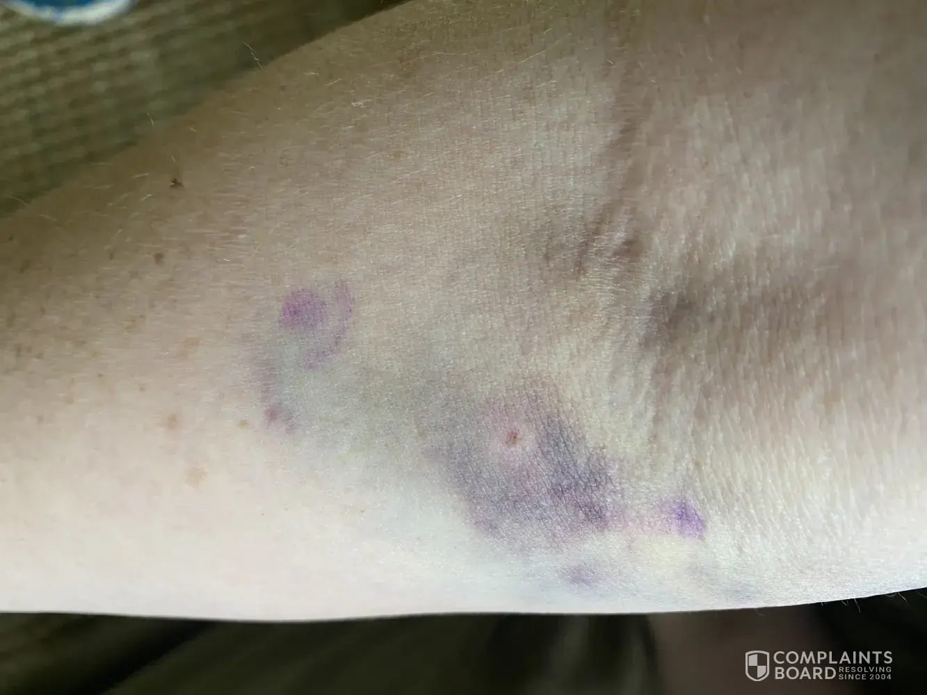 I just wanted to make you aware of the challenges I had during my last blood donation. It was at the end of the day at the American Legion in Waxhaw, NC. 4/15 at 5:30. Normally, I have a pleasant experience when donating blood. I wondered if it was because it was the end of the day and they were ready to go. Some of the nurses were cleaning up things while I was waiting. After a 20 minute wait after my appointment time I was checked in and cleared for my blood donation. The gentleman had trouble finding my vein which is an extremely unusual occurrence when I donate. After 2 other nurses checked he marked my arm in a spot off center. (The red spot in the picture) He inserted the needle (I felt the normal sting) and missed the vein because no blood came out. Then the other nurse came over and moved the needle around to try. I let him know that it was hurting at that point. He stopped and the third nurse came to try. She stated she would feel around first then try. She then moved the needle around got the vein, however, I informed her that I was in pain and they needed to stop and take the needle out. Throughout the whole process they left the needle in my arm and multiple people wiggled it around to find the vein instead of taking it out and starting again. The picture below shows the bruise on my arm. Which she did say would happen. She then wrapped my arm in ice. She informed me they would make my donation incomplete and I can schedule another appointment. I always enjoy giving blood and was very disappointed over this experience.