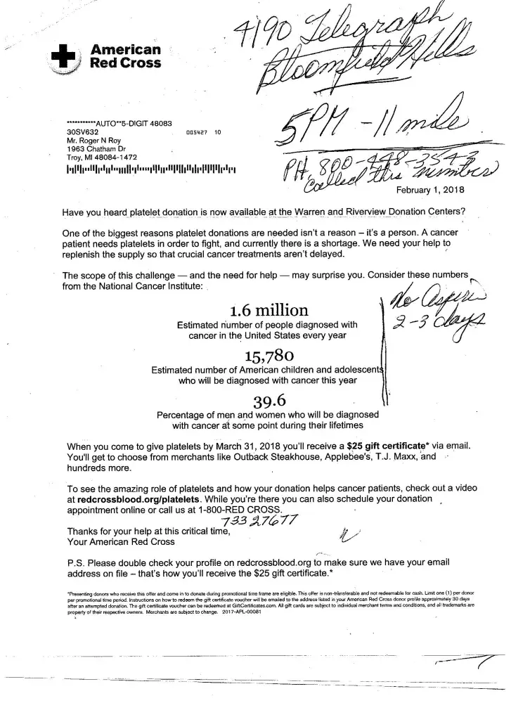 Red cross sent me a letter stating that if I gave blood platelets by the end of march that I would have a choice of a $25 gift card at many different restaurants.