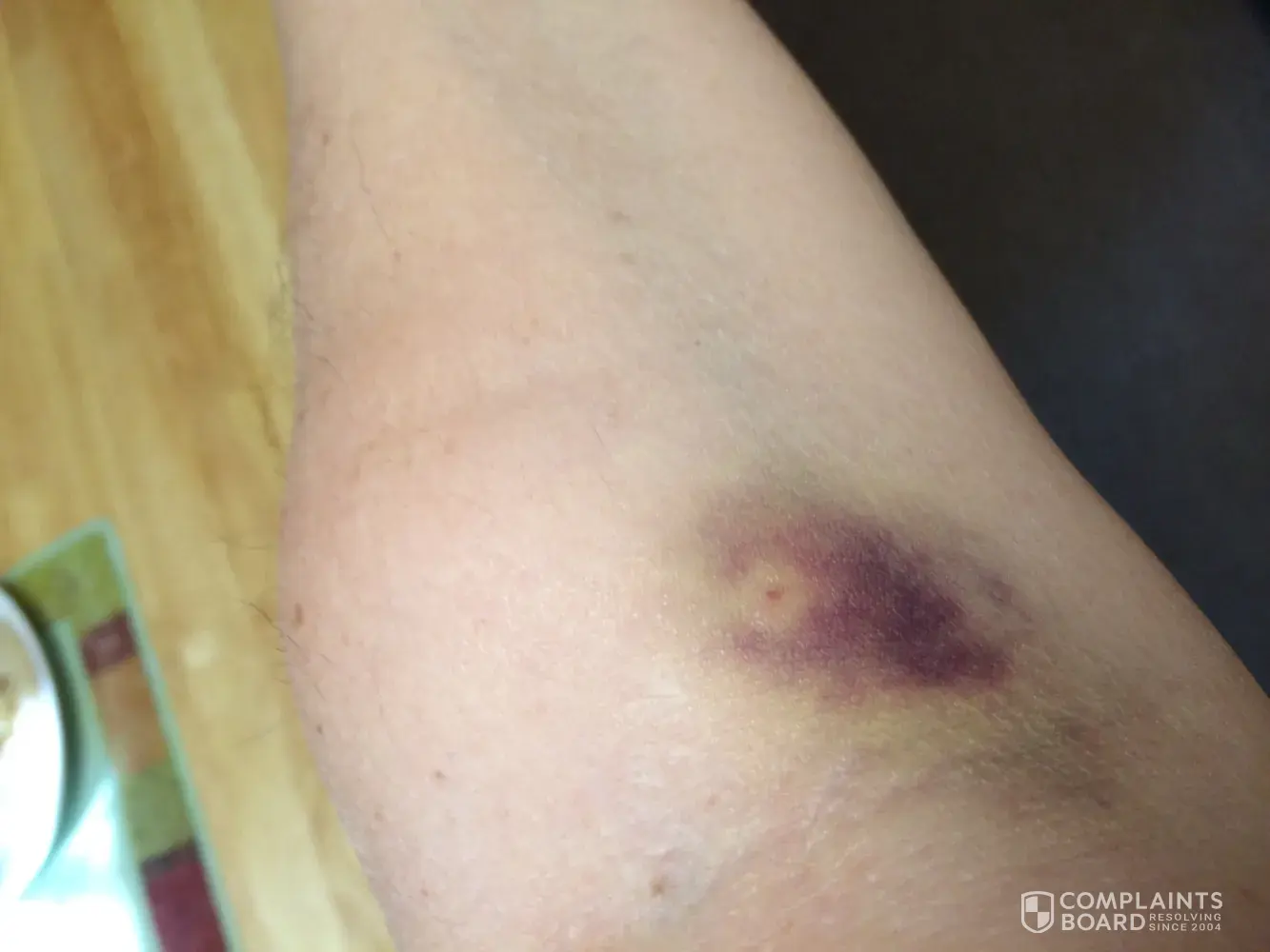 I woke up today with a huge bruise and a sore arm. This has not happened prier to this donation
