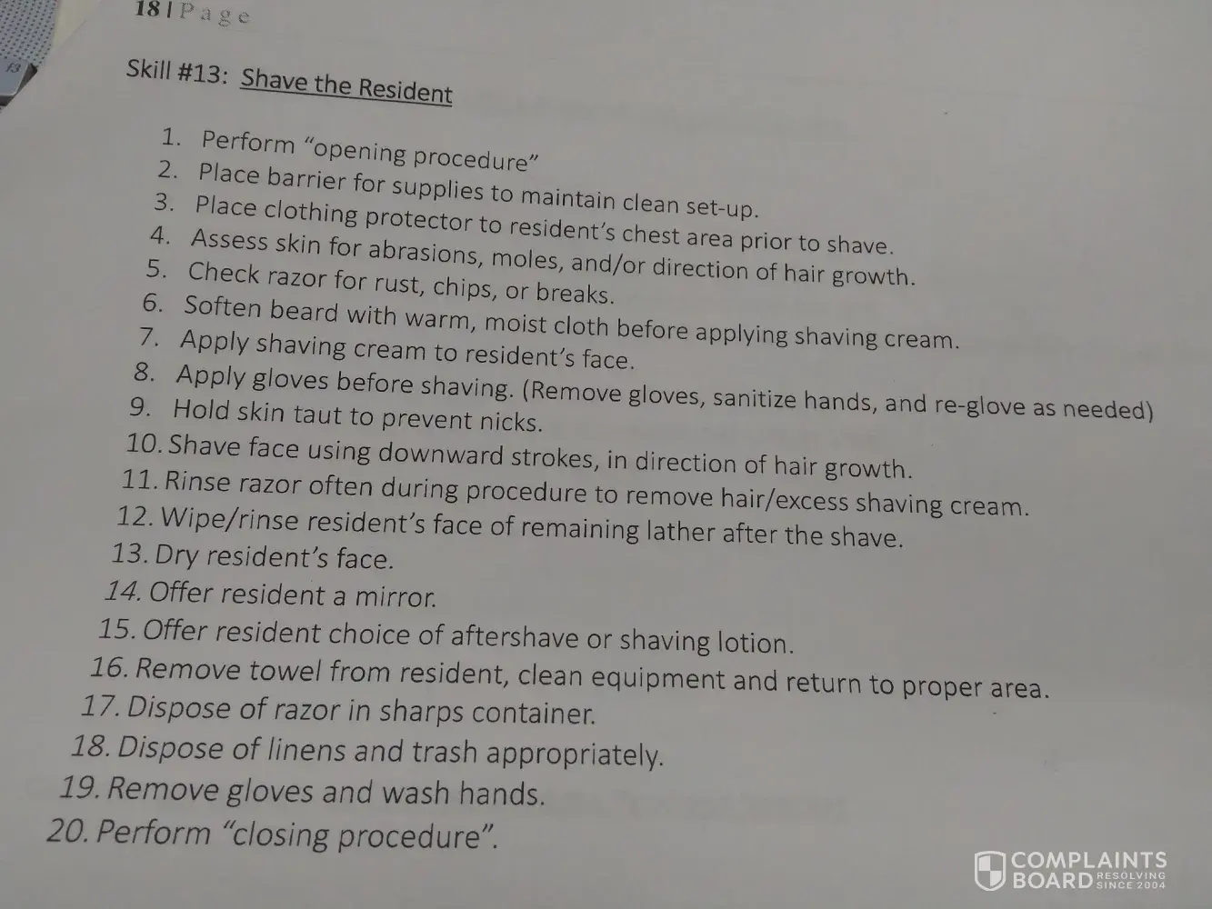 For personal care, I drew the card "Shaving" and the patient I was paired up with can vouch for me that I did the skill, BY THE BOOK (specifically the American Red Cross CNA handbook)! I was shocked to hear that I had not pass her evaluations so I asked her what I messed up on. Apparently it was because I had not shaved the female (assumed male for shaving purposes) patient's invisible mustache and goatee. Nowhere in the American Red Cross handbook for either the 2016 or 2017 versions stated which part of the faces I had to shave. I specifically verbalized and showed my evaluator that I would taut skin and shave downwards 3 strokes for both sides of the face, and taut skin and shave upwards 3 strokes for the neck area (as stated by the handbook.) I said that I would rinse the razor between each shave in the water that I prepared and change the water after I dispose of the razor in the sharps container right after shaving my patient. I had also checked the skin for cuts and the razor for rusts. Everything was perfect.