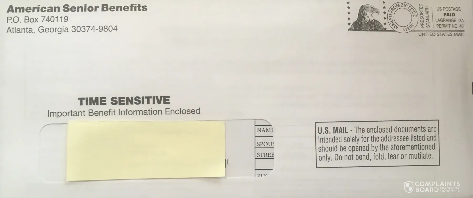 My Uncle and I each received a solicitation letter from American Senior Benefits that implied that signing up for their program would give you benefits that would pay for your funeral expenses so that your family isn't burdened with that expense. It is clearly worded in a deceiving manner to 1) make you think that it is MANDATED, even though the word they use is state-REGULATED, 2) think that this is an absolutely for-sure benefit due to you. The outer envelope was marked TIME SENSITIVE to make it seem this was an urgent, important matter.
