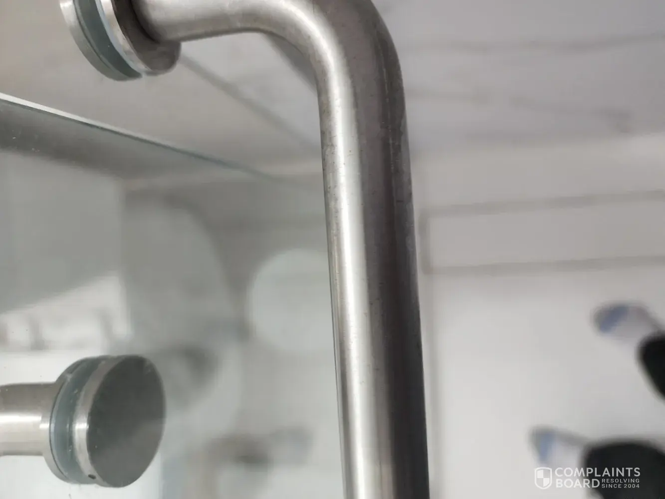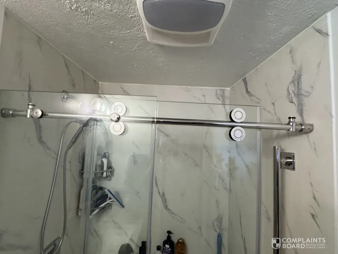 Desired outcome: Replace shower door bar and repair caulking free of charge.