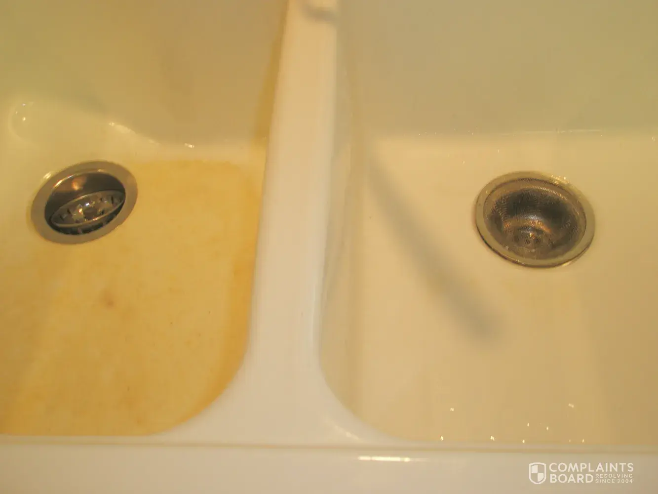 We built our home 16 years ago. About 5 years ago, I wrote and sent a photo of our double Americast American Standard kitchen sink ( white porcelain). The sink had rusted all around the top. You sent me a replacement sink which was fine for a while. The replacement sink on the left now has the finish worn off at the bottom. The entire area keeps turning brown and is very rough not like the smooth porcelin sides. We have other American Standard products in our home and have been very satisfied with them. However, this sink has always been a problem. I am very discouraged with this sink and do hope you can help me. I have included a photo to validate my concern.
