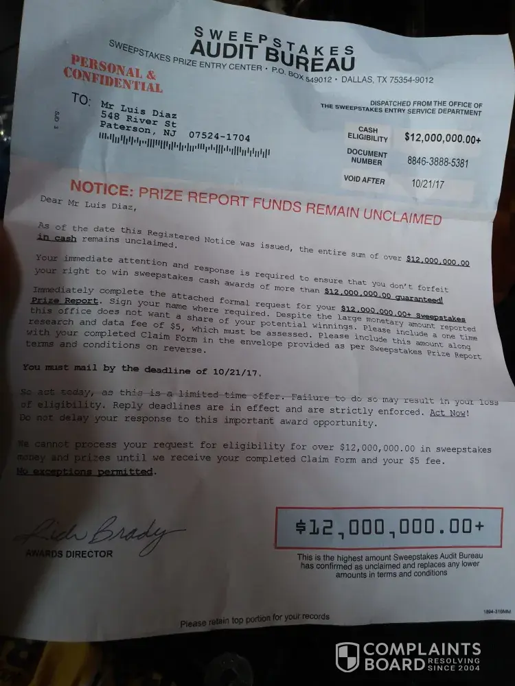 12 American Sweepstakes Publishers (A.S.P.) Complaints