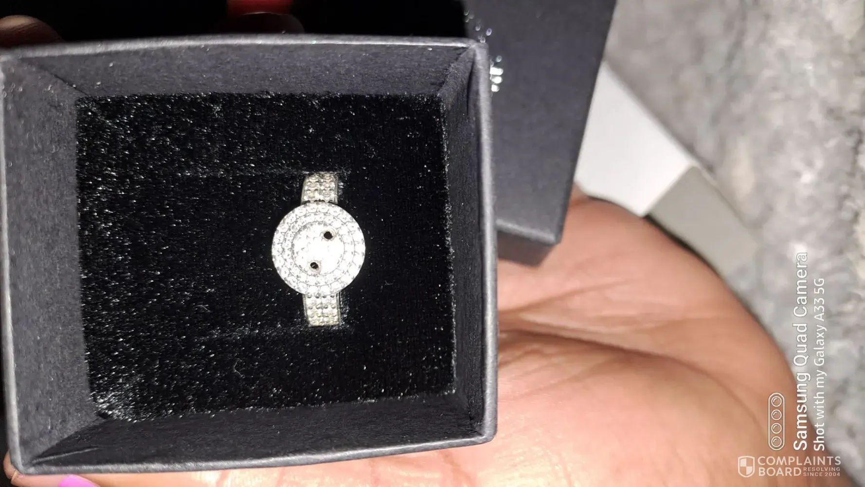 I woke up with 1 diamond missing and i called my husband and told him he promised to come back home early so that we can go u A Swiss to return it but 5-7 minutes later another got missing so i had to take it off...mind you i bought this ring a week ago 25th August 2023 in Port Elizabeth Metlife Mall