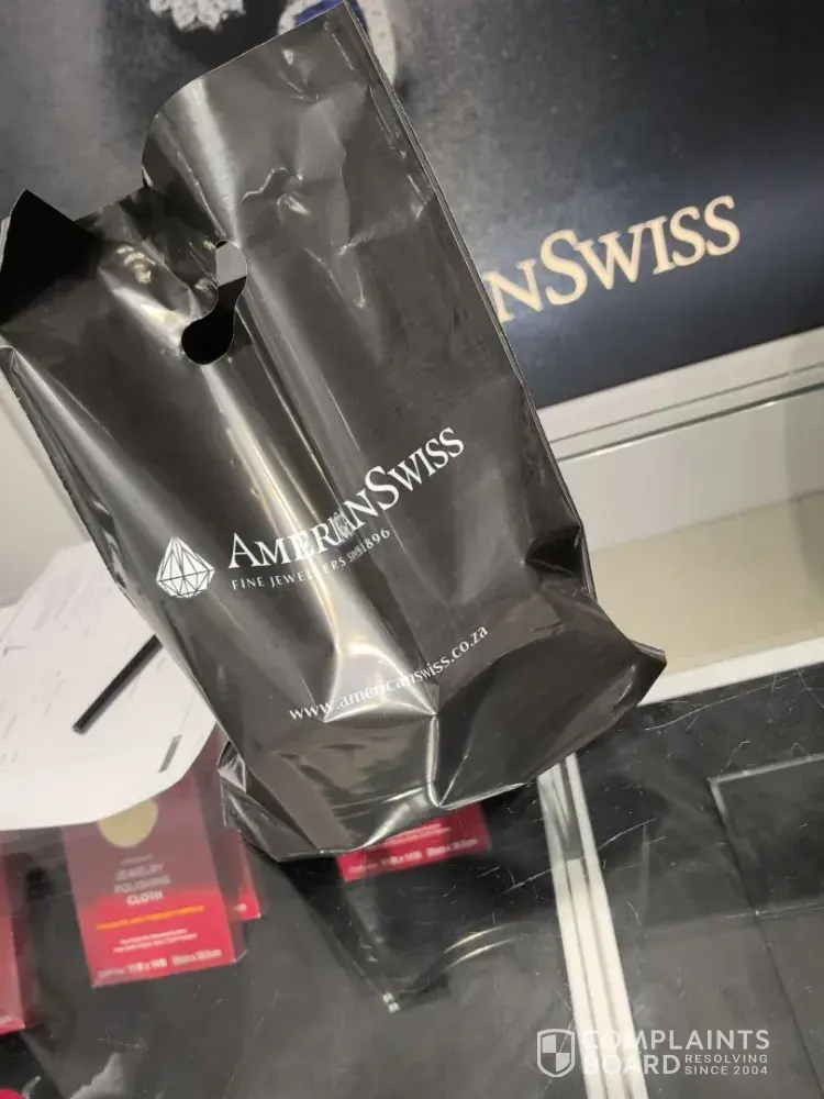 In early January 2015 we got a call from AMERCIAN SWISS Head Office asking us to fax or scan them the proof of purchase of the ring as they received the ring but needed the proof of purchase to confirm the date the ring was bought. My fiancé asked how they could ask him for the proof of purchase surely AMERCIAN SWISS AT RIVERSIDE MALL IN NELSPRUIT should provide them with this information and not the customer. My fiancé told the lady from head office about our experience with the ring and how it left a bitter taste in our mouths. The lady from head office said she would sort out the issue with AMERCIAN SWISS AT RIVERSIDE MALL IN NELSPRUIT. About an hour later we got a call from AMERCIAN SWISS AT RIVERSIDE MALL IN NELSPRUIT asking us to fax or bring in the proof of payment because head office needs it and they don’t have the information. In disbelief my fiancé said he would like to resolve this issue as soon as possible because he could see how it is affecting me he went to American Swiss the same day to give them the necessary paperwork. The ring was in packet where it had never come out since 20 Dec 2014 they asked for the back as they needed it as proof or something. Today is the 24th January 2014 and we haven’t heard anything from AMERCIAN SWISS AT RIVERSIDE MALL IN NELSPRUIT and still not a word from the Manager NICOLENE DELANGE.