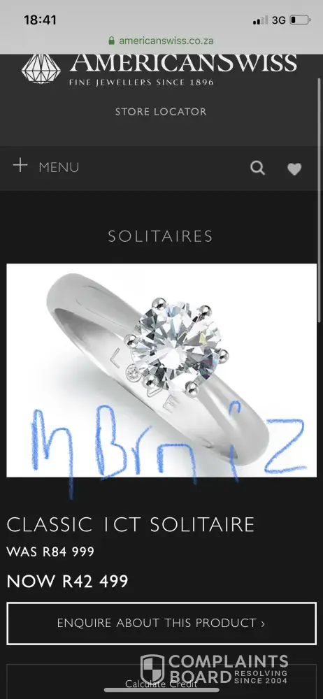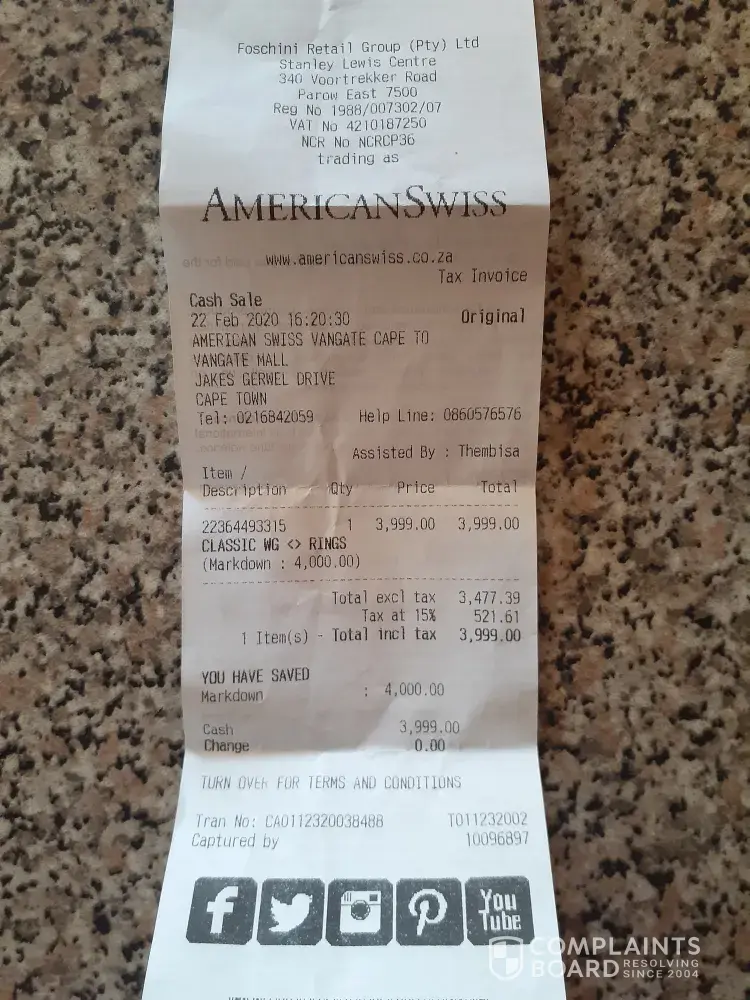 So with that being said, I would like to be refunded the value at which I purchased this ring. I have opted to first communicate this to the head office of American Swiss, which I believe will assist accordingly. If otherwise, I can explore other avenues of consumer dissatisfaction which may tarnish the reputation of the organisation.