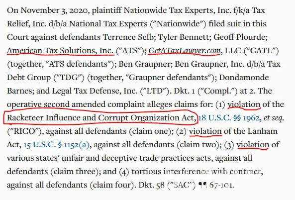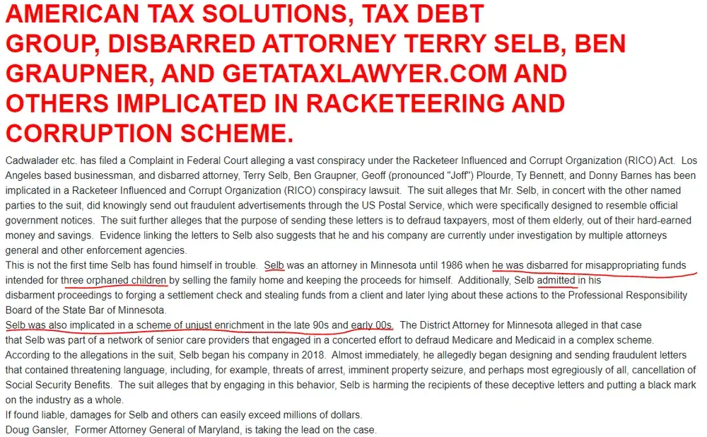 I was defrauded of $2,700 from Tyler Bennet & American Tax Solutions and other close affiliates, Winston Parker. 12/14/22: Submitted FTC.gov consumer fraud division complaint naming Tyler Bennet, Terrence Selb, GetATaxLawyer.com, & American Tax Solutions (ATS) Gov action: Nov 22, 2022, $328,000 settlement...