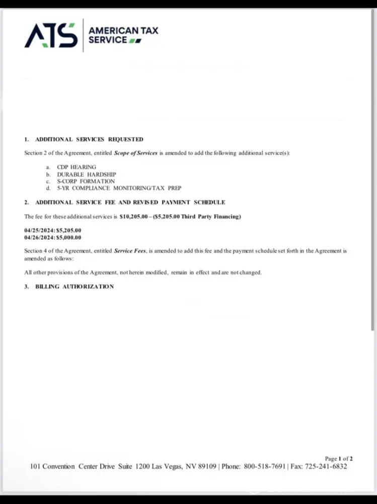 Client's agreement with American Tax Solutions dated March with undisclosed fees