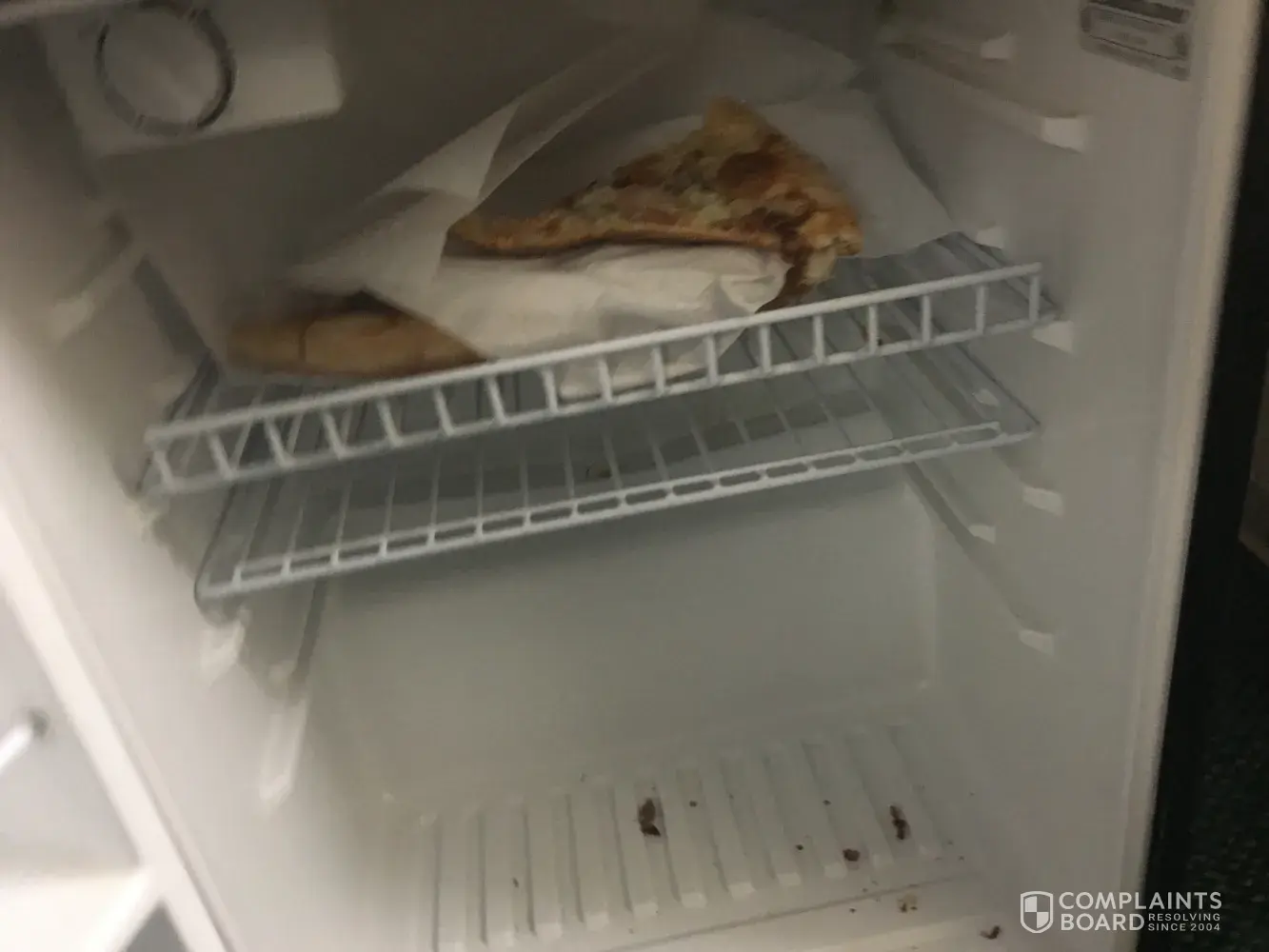 I spoke with manager and showed him a picture and told him he needs to speak with house keeping he told me that is not my decision and his only concern was to take care of me and informed me he would give a refund and I can go somewhere else and he is very rude and I will be posting pics of if I don't here from somebody from corporate office I do not usually complain but how hard is it to clean fridge