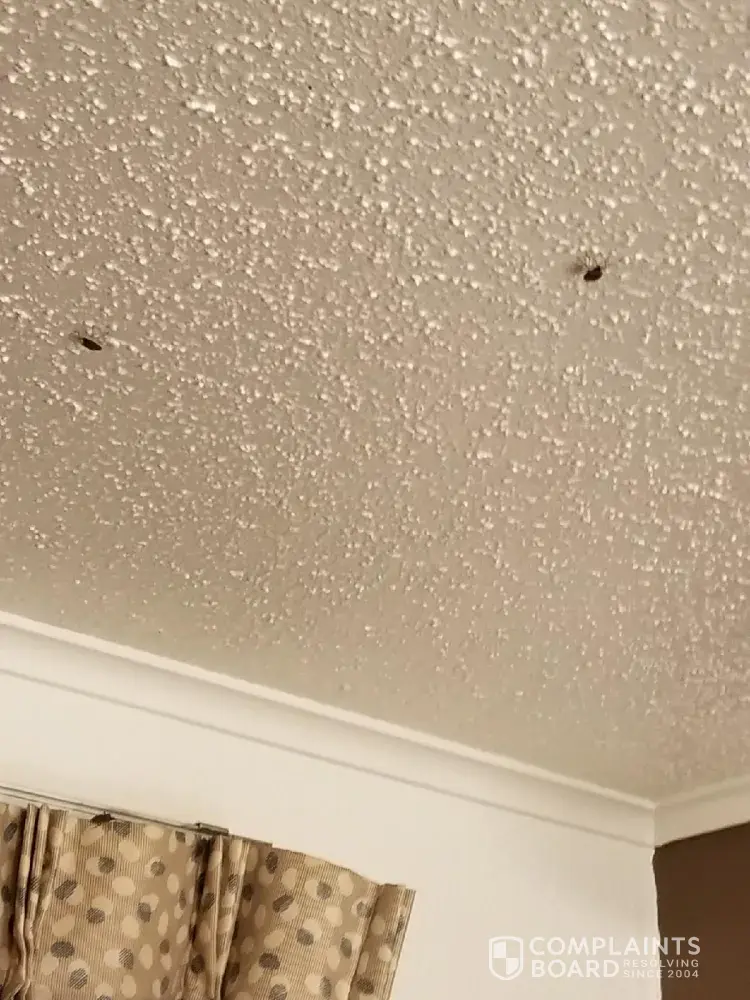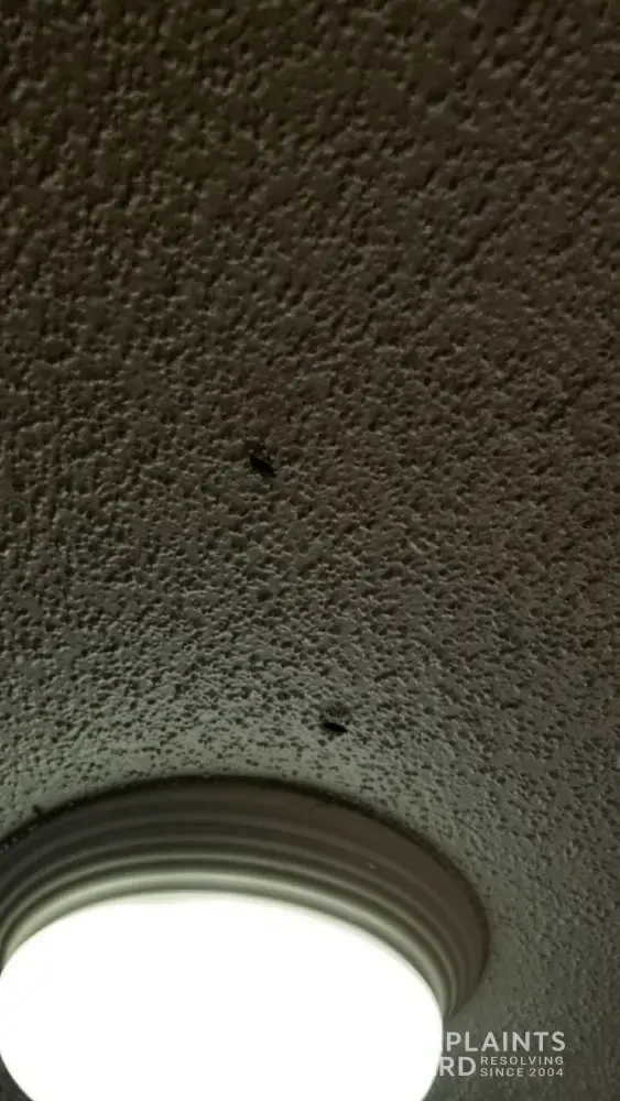 Paint peeling on the ceiling, walls, in the bathroom, stains and unknown markings on the bathroom walls, bathroom door hadn't been cleaned in forever. The carpet didn't look like it had been vacuumed in quite some time either. No vent cover in the bathroom, it was stuffed with tissue or toilet paper. Shower rod had been replaced and the holes from previous one were still there with large chunks of plaster on the floor.