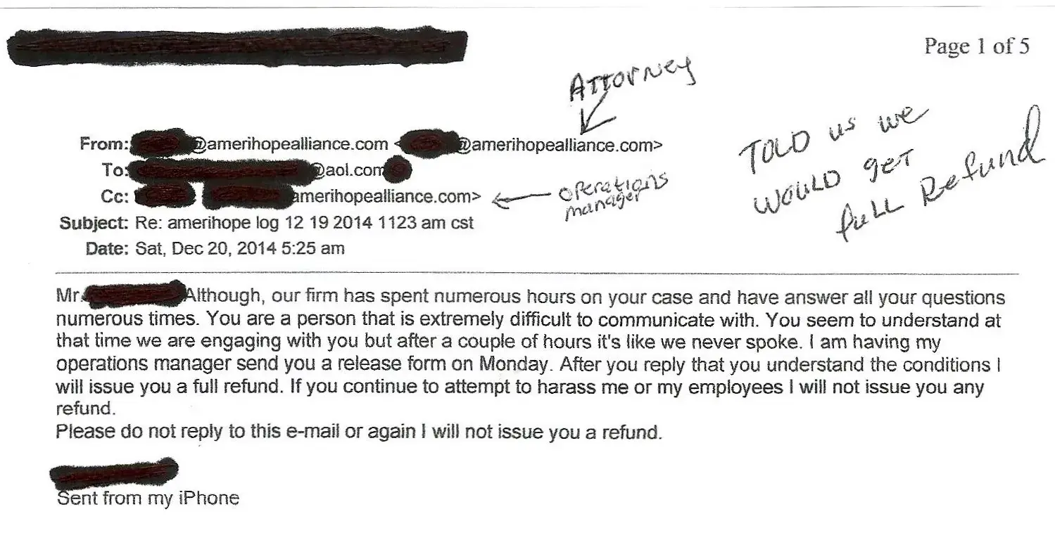 Retained this firm and seems to me they did what they wanted on case. Anyways the owner of this company sends me an email that he will issue me a full refund. His operations manager would contact me Monday. She did on Tuesday and only offering partial refund now. The owner should have not made me that offer of full refund if his operations manager changes to partial. owner is an attorney and to me the email I consider a legal contract. Still no refund. I have emailed them and let them know I will be filing complaints with ARDC and have started filing on line also. Still no reply to the post or emails