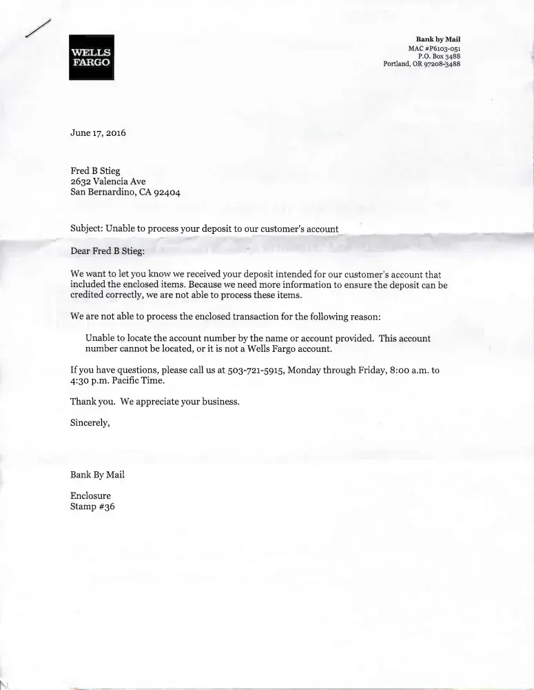 From Well Fargo I received June 17, 20016 "Unable to locate the account number by the name or account provided. This account number cannot be located, or it is not a Well Fargo account. I have had this account for over ten years.