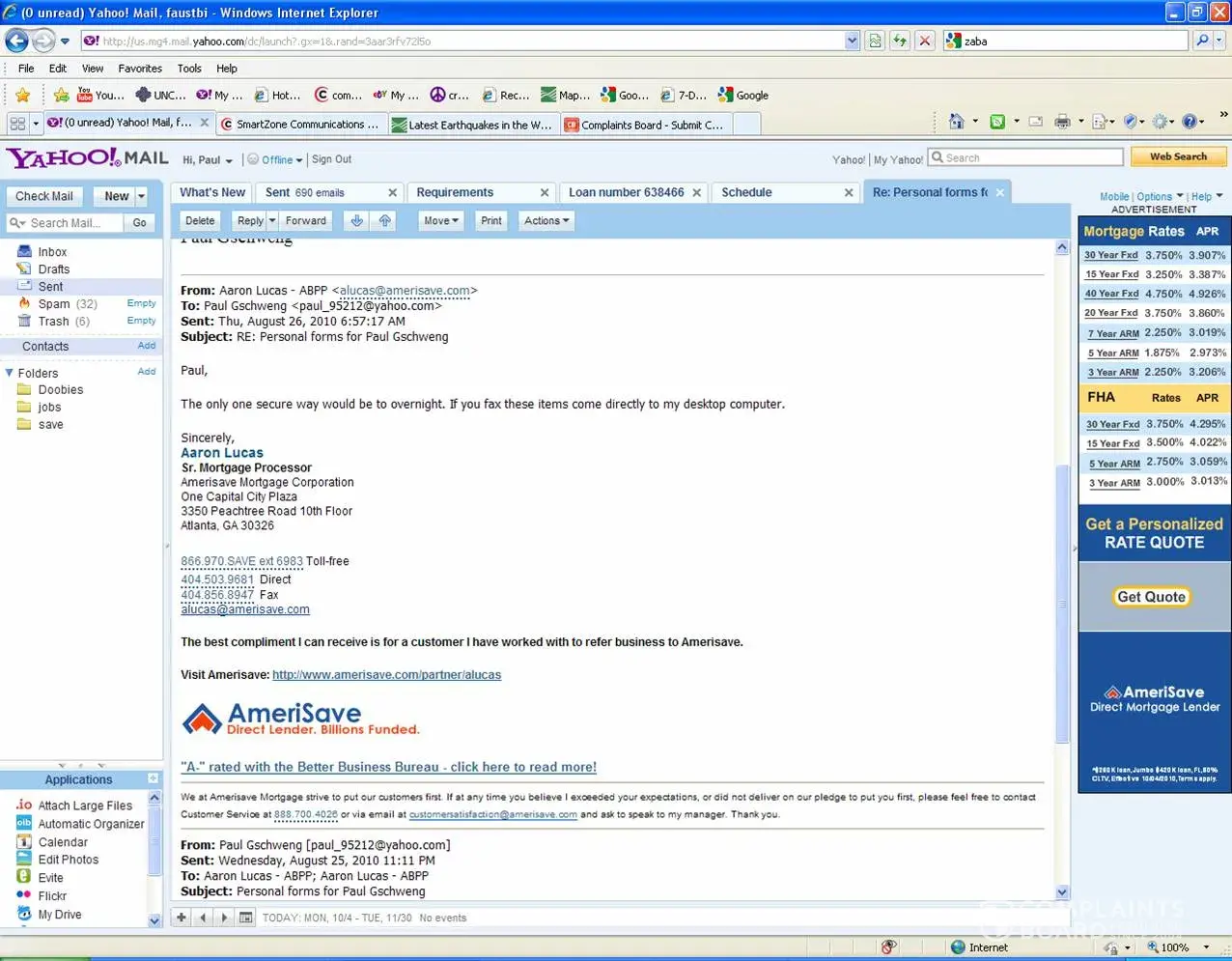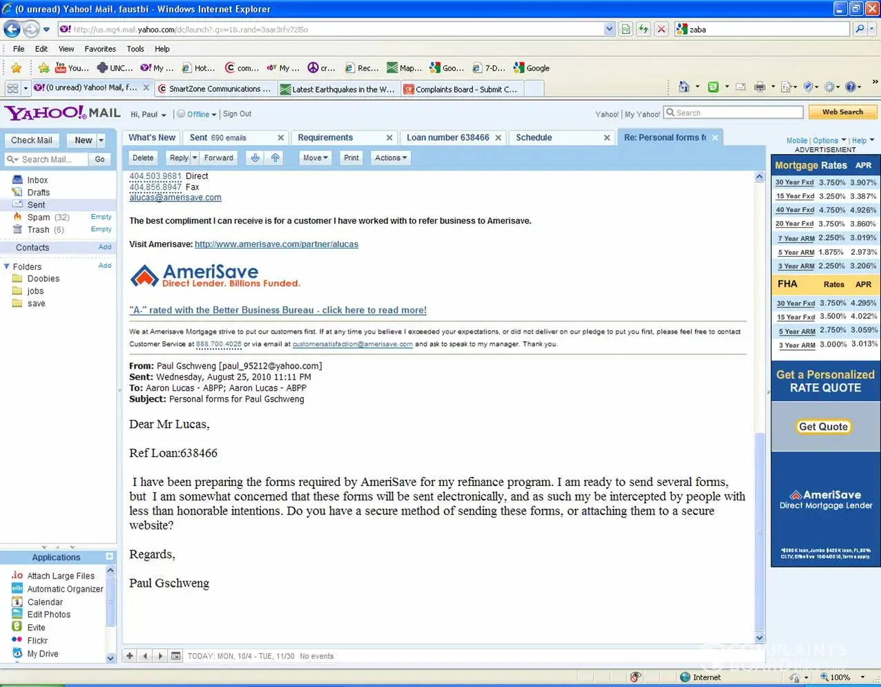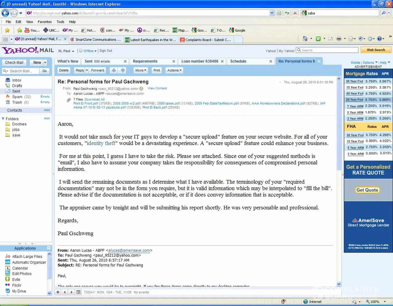 I had sent Amerisave many, many personal documents including bank statements, bank account numbers, personal tax information, retirement information, etc., etc.