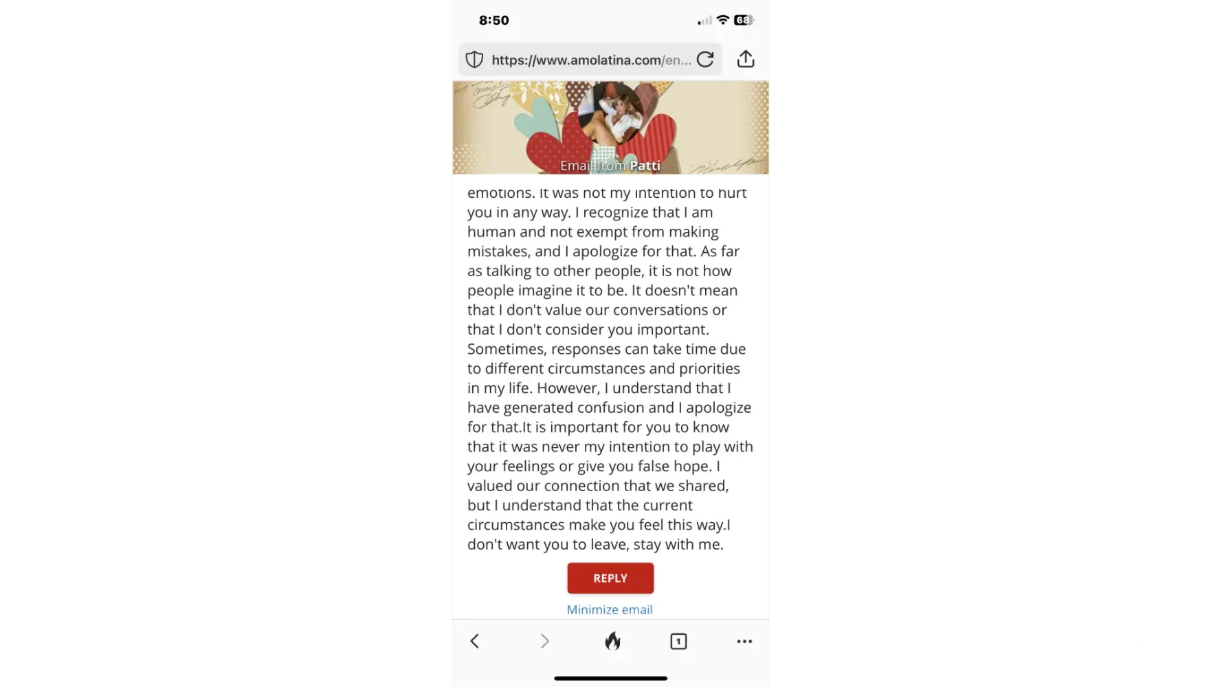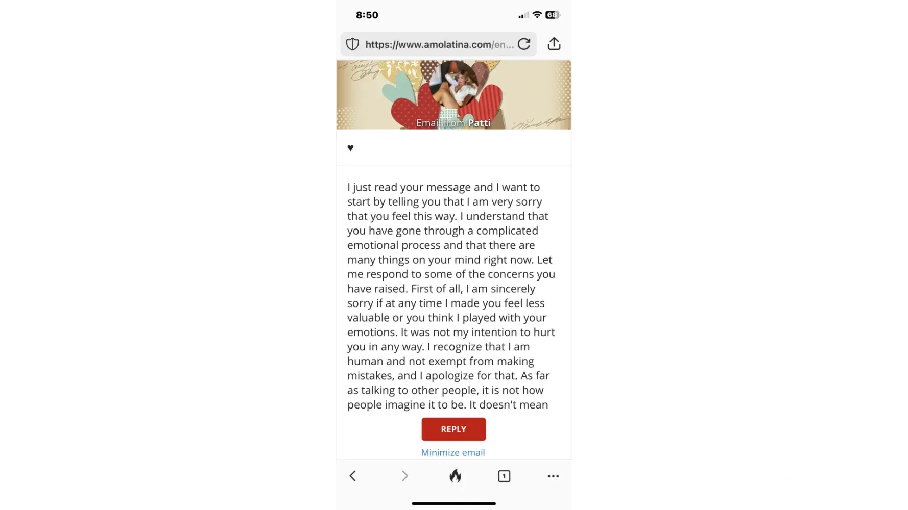 The woman I was talking to on Amolatina finally admitted that our relationship wasn’t real. She told me for over a year that she loved me and wanted to marry me. She even said that she wanted to come visit me. But she sent me a email last night saying she was sorry and that she never meant to give me false hope and that basically she was playing with my emotions. I’m going to try to add the email but it’s on two pages. Don’t waste your time with Amolatina, dating, girlsonlydating, Hotti or any dating site that’s under SOL. They are ripping people off of their hard earned money.