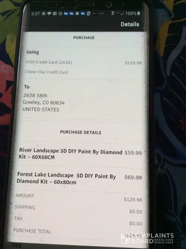 I ordered and paid for two Paint By Diamond kits on May 17, 2019. Attached is a copy of the order details and payment receipt. I have contacted the company three times regarding the status of the order. They responded and provided a tracking number which was never valid. I was then told the order was lost and it would be resent. This has never occurred. I am extremely disappointed in this company. I want to file a claim to get my money back. The invoice ID is c8391705559151.1 and transaction ID 5LH34301YT883132U