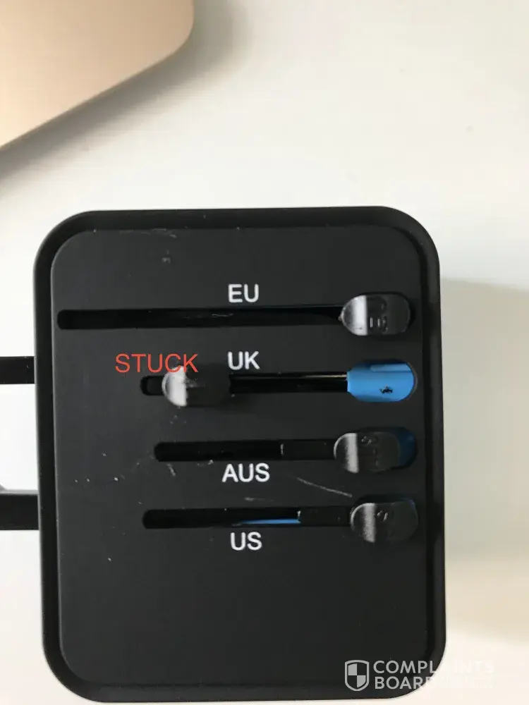 I bought the travel adaptor in early August 2018. It is a travel adaptor with four knobs to pull back and fourth along a groove, , each knob when pulled out configures a plug suitable for a region or country, in this case, US, UK, EU and AU. I took it out of the package and shifted the knob for a UK plug and it promptly got stuck there and could not be moved back to its original position This means of course that all the other knobs are unusable. . This is unbelievable poor craftsmanship. In other words selling junk! I found this site only by putting the company AN associates into google and was led promptly to site because there were many other complaints about this company. DON'T DO BUSINESS WITH THEM! YOU HAVE BEEN WARNED.