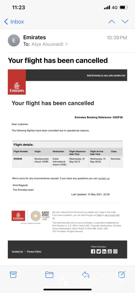I booked from 13 May to 18 May 2021 .. Unfortunately the flight from United Arab Emirates has been cancelled due to the current situation COVID 19